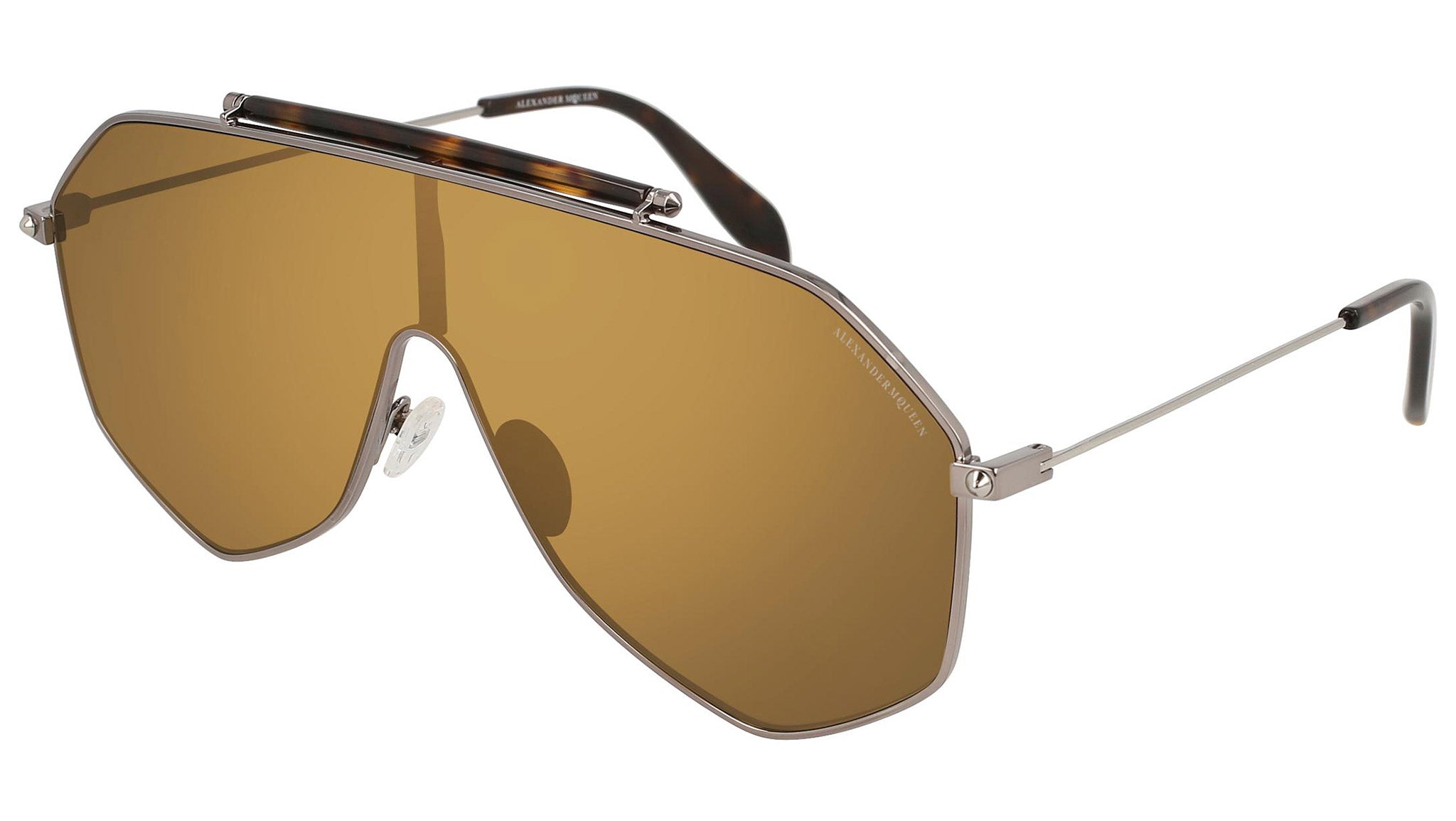 AM0138S 002 sunglasses by Alexander McQueen with shiny dark ruthenium frame and solid brown and mirror bronze lenses. Alexander McQueen Eyewear eyewear styles represent a juxtaposition between contrasting elements: femininity and masculinity, fragility and strength, tradition and modernity. An innovative and uncompromising identity of the fashion house.
