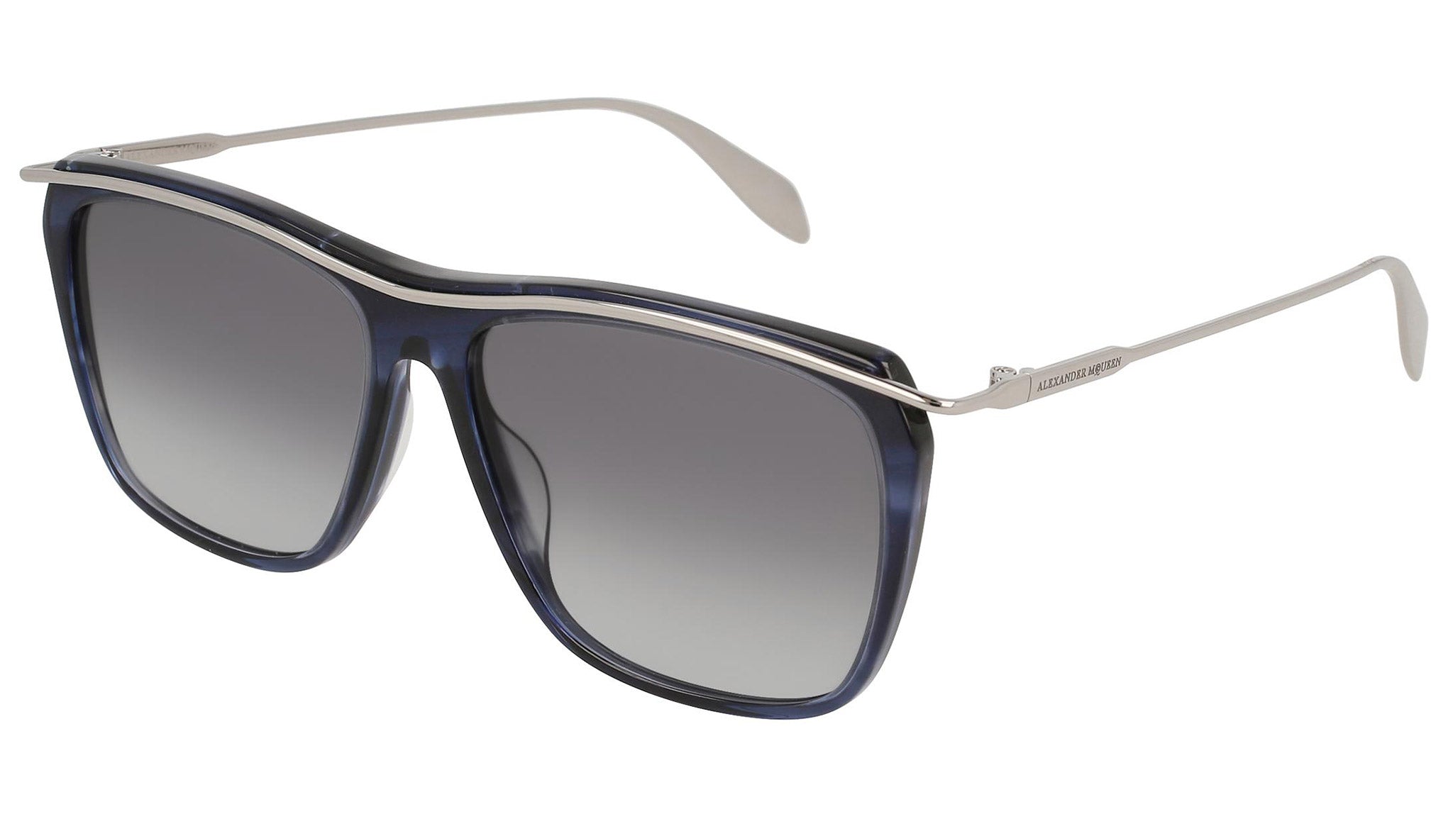AM0143S 008 sunglasses by Alexander McQueen with shiny striped blue havana and shiny light ruthenium frame and gradient blue lenses. Alexander McQueen Eyewear eyewear styles represent a juxtaposition between contrasting elements: femininity and masculinity, fragility and strength, tradition and modernity. An innovative and uncompromising identity of the fashion house.