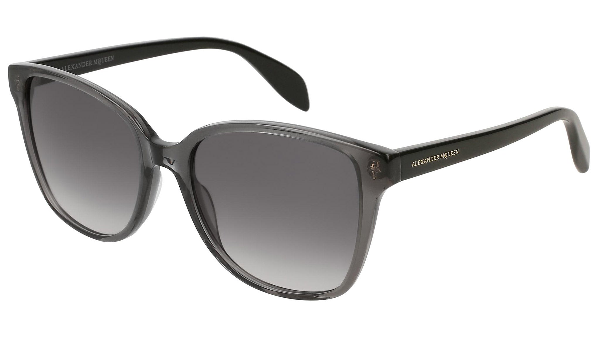 AM0145S 001 sunglasses by Alexander McQueen with shiny transparent dark grey frame and gradient grey lenses. Alexander McQueen Eyewear eyewear styles represent a juxtaposition between contrasting elements: femininity and masculinity, fragility and strength, tradition and modernity. An innovative and uncompromising identity of the fashion house.
