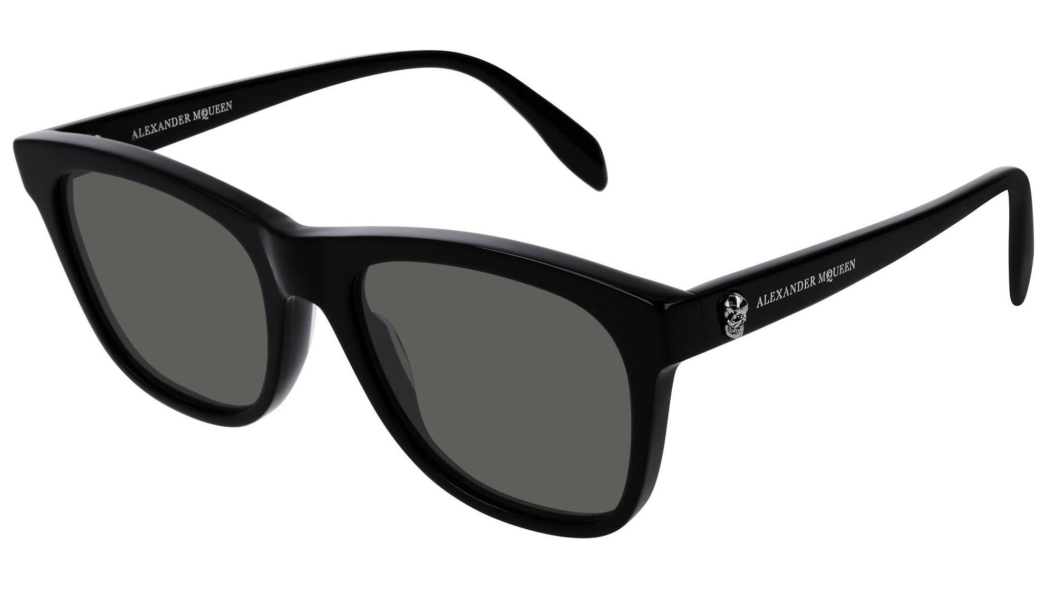 AM0158S 001 sunglasses by Alexander McQueen with shiny black frame and solid grey lenses. Alexander McQueen Eyewear eyewear styles represent a juxtaposition between contrasting elements: femininity and masculinity, fragility and strength, tradition and modernity. An innovative and uncompromising identity of the fashion house.