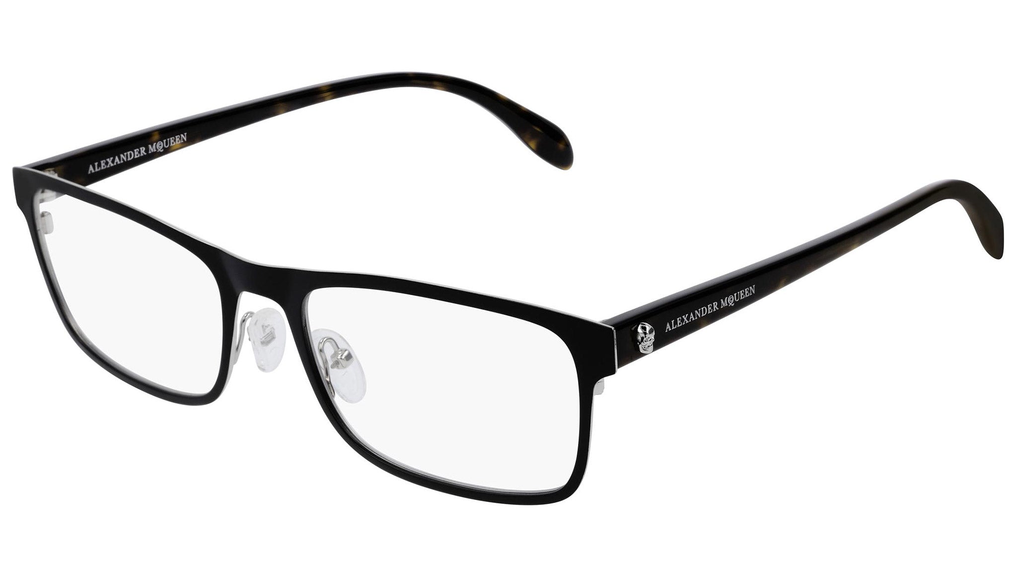 Alexander McQueen optical glasses model AM0163O 002 featuring semimatte black and shiny silver frame and havana colour temple. Synonymous with fearless fashion, Alexander McQueen Eyewear eyewear styles represent a juxtaposition between contrasting elements, as his runway styles are unique and inspiring.