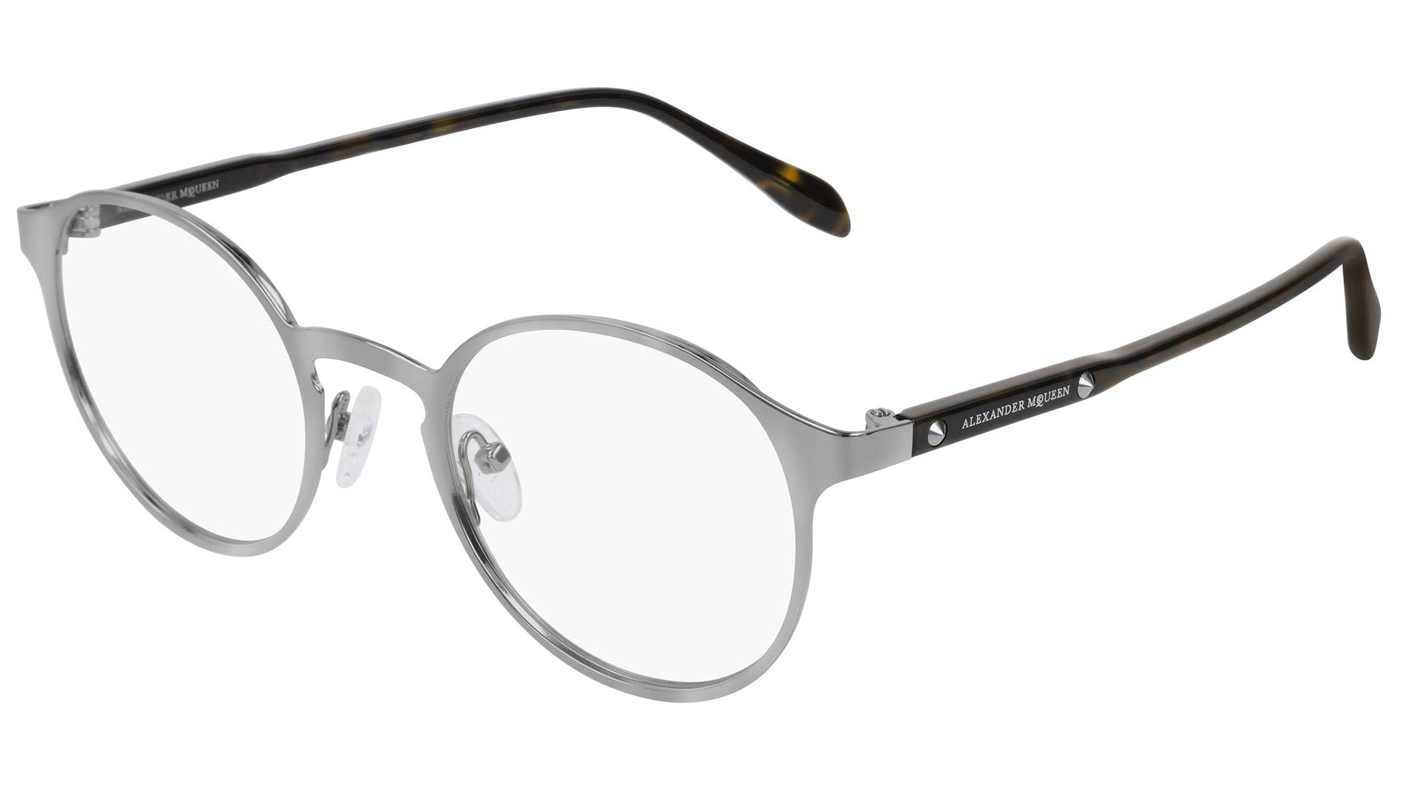Alexander McQueen optical glasses model AM0166O 003 featuring shiny light ruthenium frame and havana colour temple. Synonymous with fearless fashion, Alexander McQueen Eyewear eyewear styles represent a juxtaposition between contrasting elements, as his runway styles are unique and inspiring.
