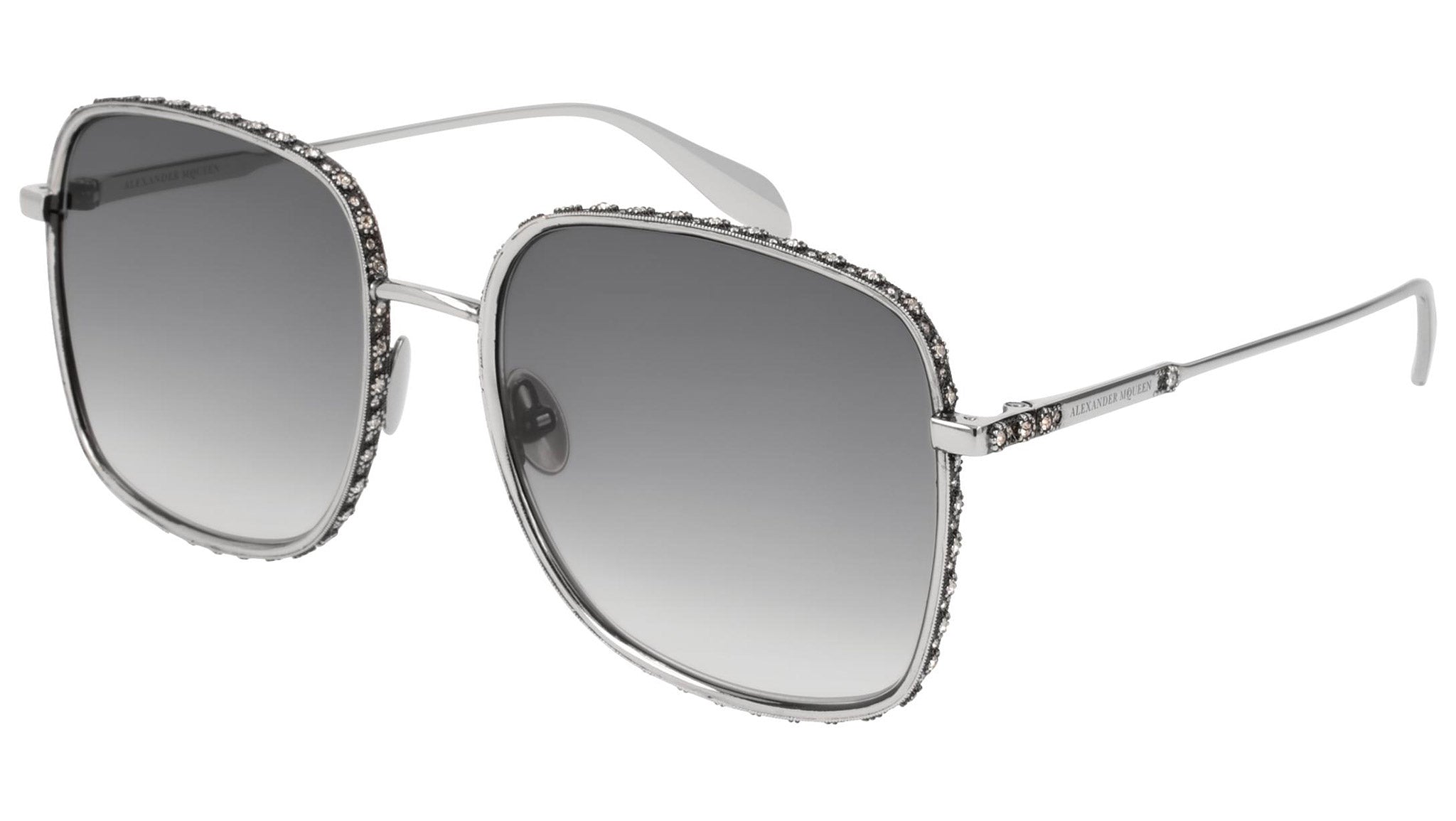 AM0180S 002 sunglasses by Alexander McQueen with shiny antique silver and greige swarovski frame and gradient grey lenses. Alexander McQueen Eyewear eyewear styles represent a juxtaposition between contrasting elements: femininity and masculinity, fragility and strength, tradition and modernity. An innovative and uncompromising identity of the fashion house.