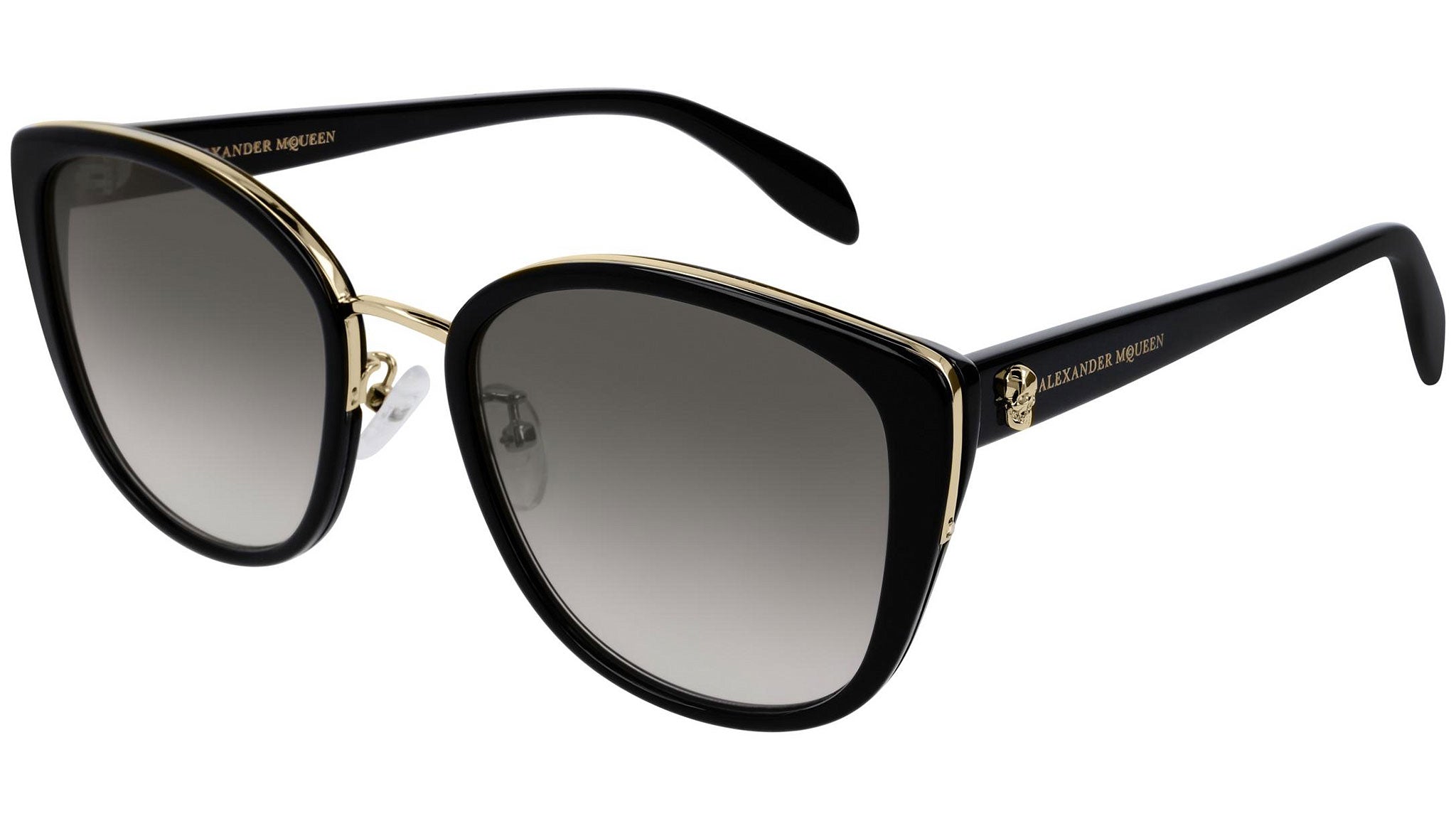 AM0186SK 001 sunglasses by Alexander McQueen with shiny light gold / shiny black frame and gradient grey lenses. Alexander McQueen Eyewear eyewear styles represent a juxtaposition between contrasting elements: femininity and masculinity, fragility and strength, tradition and modernity. An innovative and uncompromising identity of the fashion house.