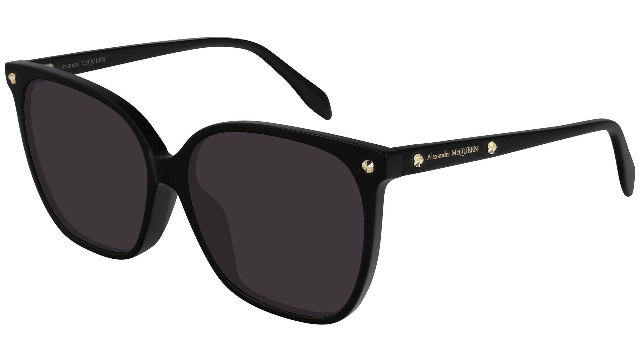 AM0188SA 001 sunglasses by Alexander McQueen with shiny black frame and solid grey lenses. Alexander McQueen Eyewear eyewear styles represent a juxtaposition between contrasting elements: femininity and masculinity, fragility and strength, tradition and modernity. An innovative and uncompromising identity of the fashion house.