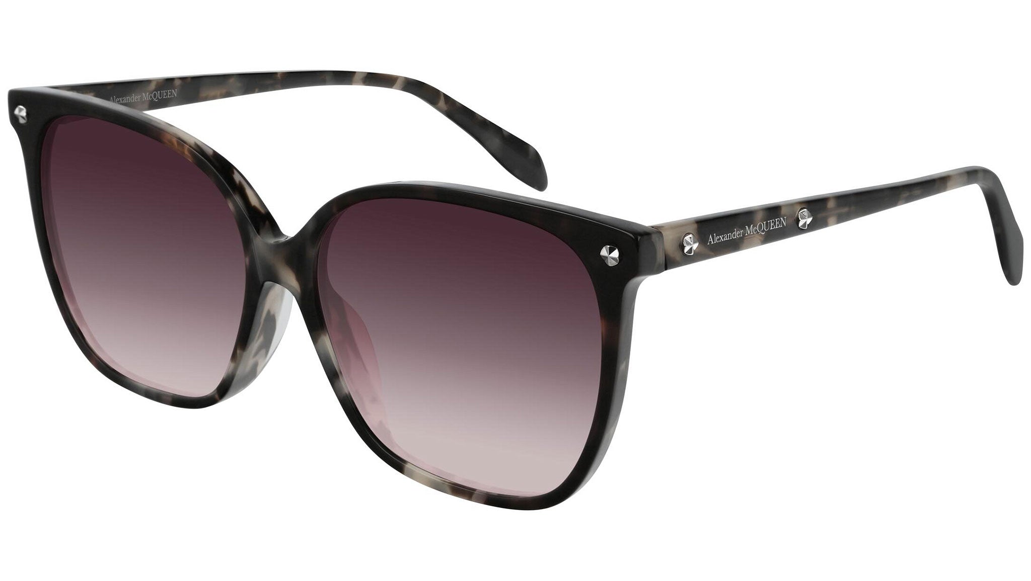 AM0188SA 004 sunglasses by Alexander McQueen with shiny gradient dark havana / spotted dark grey havana frame and gradient bordeaux lenses. Alexander McQueen Eyewear eyewear styles represent a juxtaposition between contrasting elements: femininity and masculinity, fragility and strength, tradition and modernity. An innovative and uncompromising identity of the fashion house.