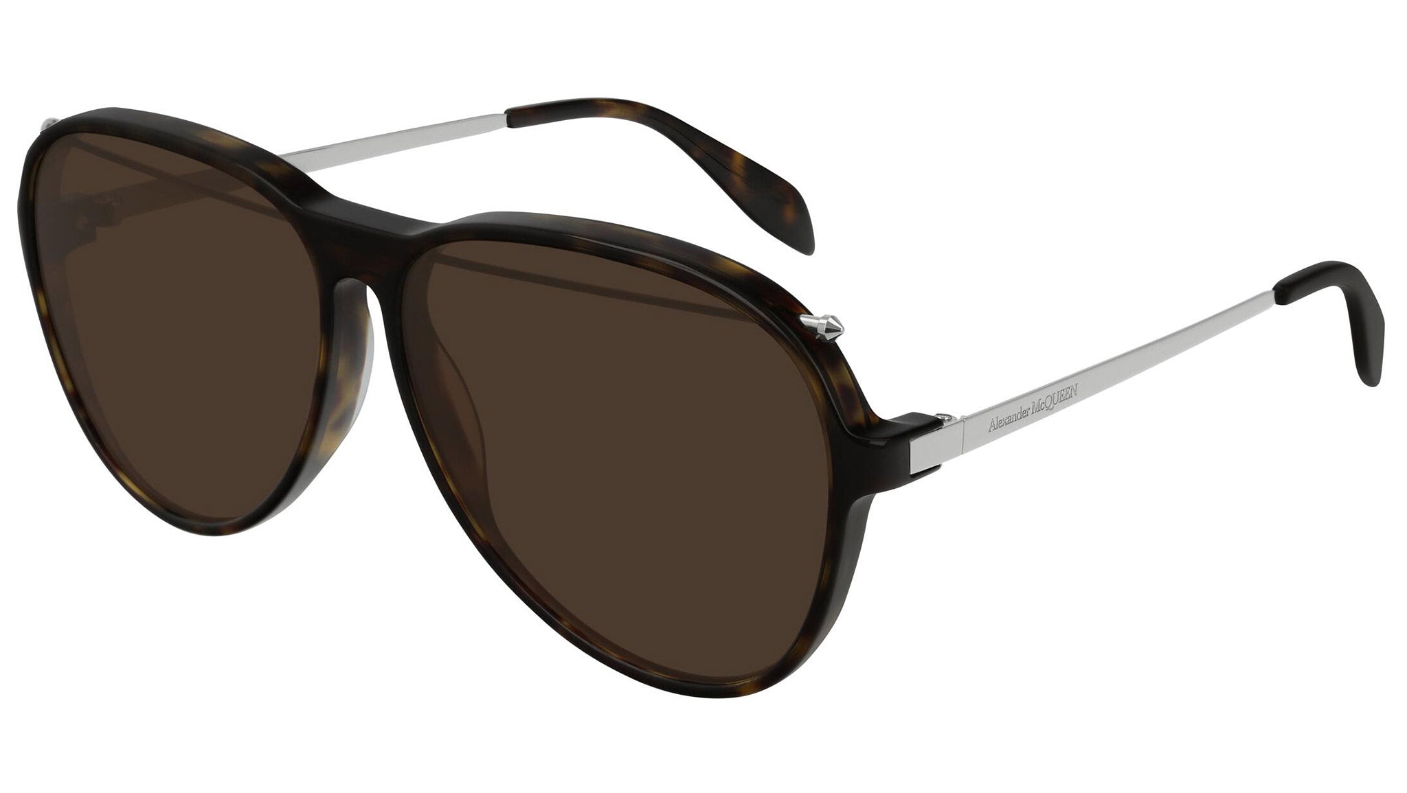AM0193S 002 sunglasses by Alexander McQueen with shiny dark havana frame and solid brown lenses. Alexander McQueen Eyewear eyewear styles represent a juxtaposition between contrasting elements: femininity and masculinity, fragility and strength, tradition and modernity. An innovative and uncompromising identity of the fashion house.