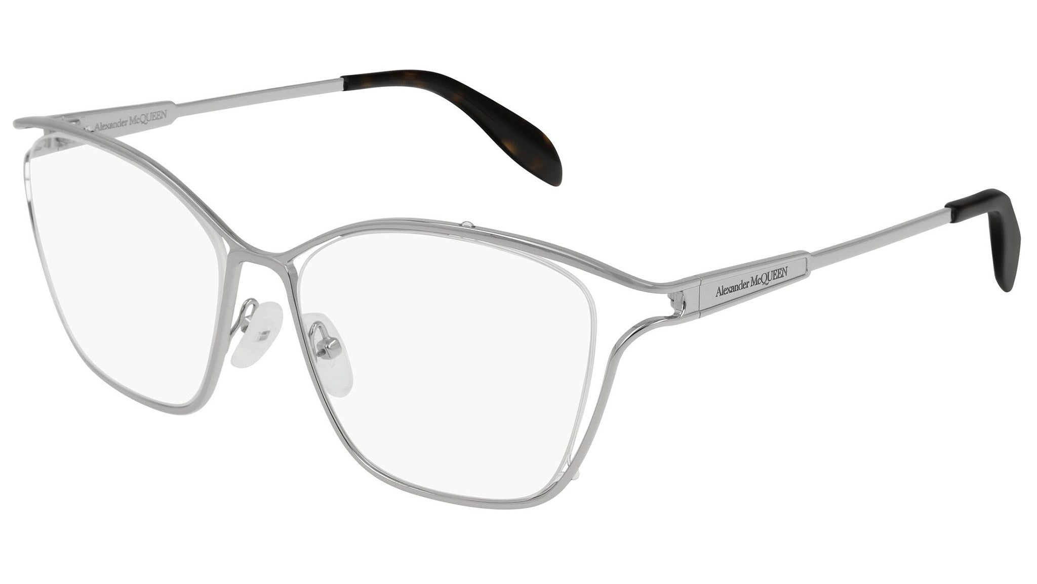 Alexander McQueen optical glasses model AM0196O 003 featuring shiny silver frame and silver colour temple. Synonymous with fearless fashion, Alexander McQueen Eyewear eyewear styles represent a juxtaposition between contrasting elements, as his runway styles are unique and inspiring.