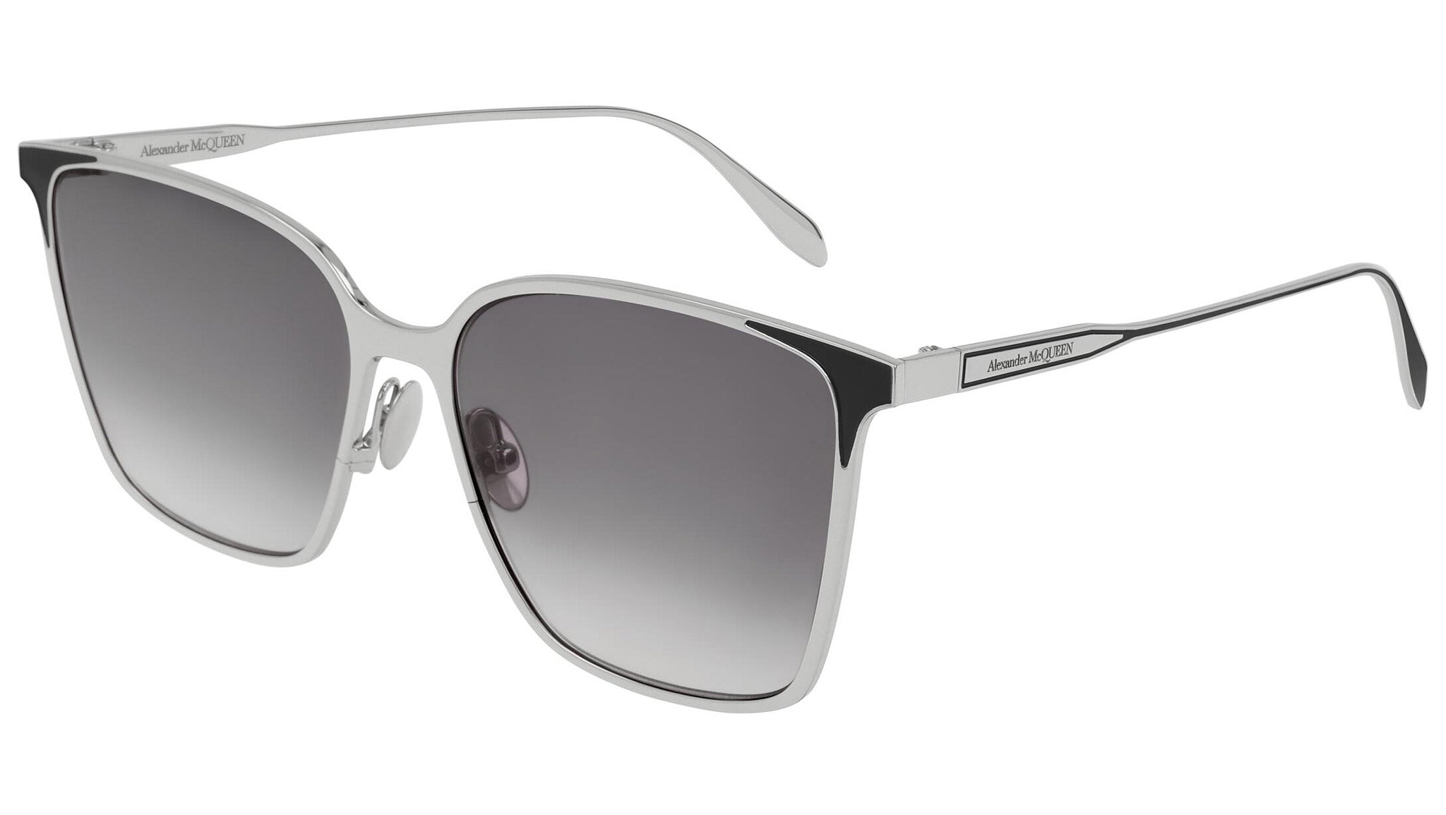 AM0205S 002 sunglasses by Alexander McQueen with shiny silver and black frame and gradient grey lenses. Alexander McQueen Eyewear eyewear styles represent a juxtaposition between contrasting elements: femininity and masculinity, fragility and strength, tradition and modernity. An innovative and uncompromising identity of the fashion house.