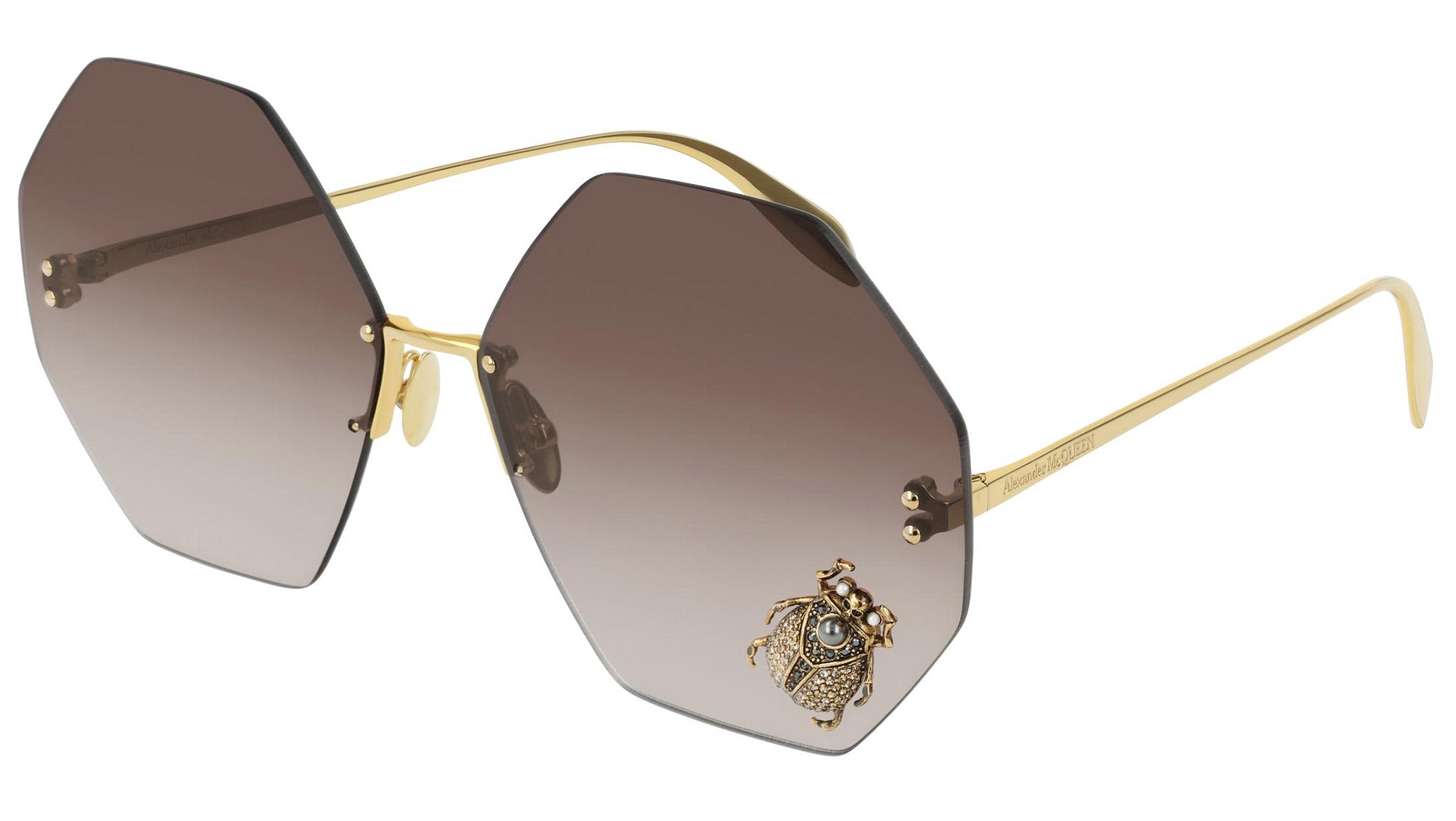 AM0208S 002 sunglasses by Alexander McQueen with shiny endura gold frame and gradient brown lenses. Alexander McQueen Eyewear eyewear styles represent a juxtaposition between contrasting elements: femininity and masculinity, fragility and strength, tradition and modernity. An innovative and uncompromising identity of the fashion house.