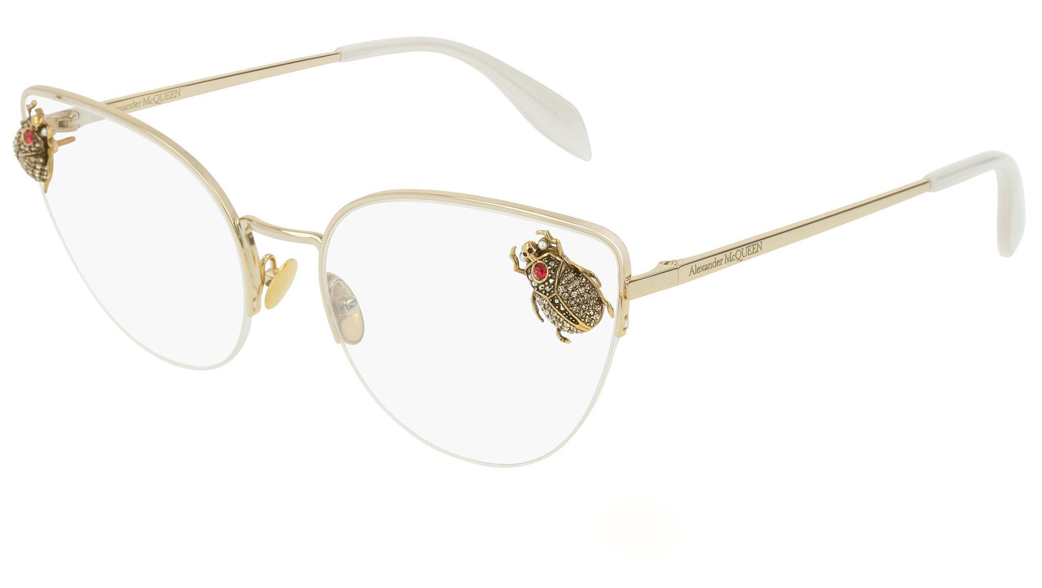Alexander McQueen optical glasses model AM0209O 002 featuring shiny light gold frame and gold colour temple. Synonymous with fearless fashion, Alexander McQueen Eyewear eyewear styles represent a juxtaposition between contrasting elements, as his runway styles are unique and inspiring.