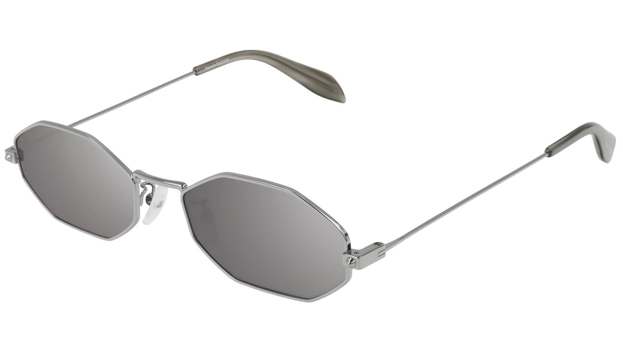 AM0211SA 004 sunglasses by Alexander McQueen with shiny ruthenium frame and solid grey + mirror silver lenses. Alexander McQueen Eyewear eyewear styles represent a juxtaposition between contrasting elements: femininity and masculinity, fragility and strength, tradition and modernity. An innovative and uncompromising identity of the fashion house.