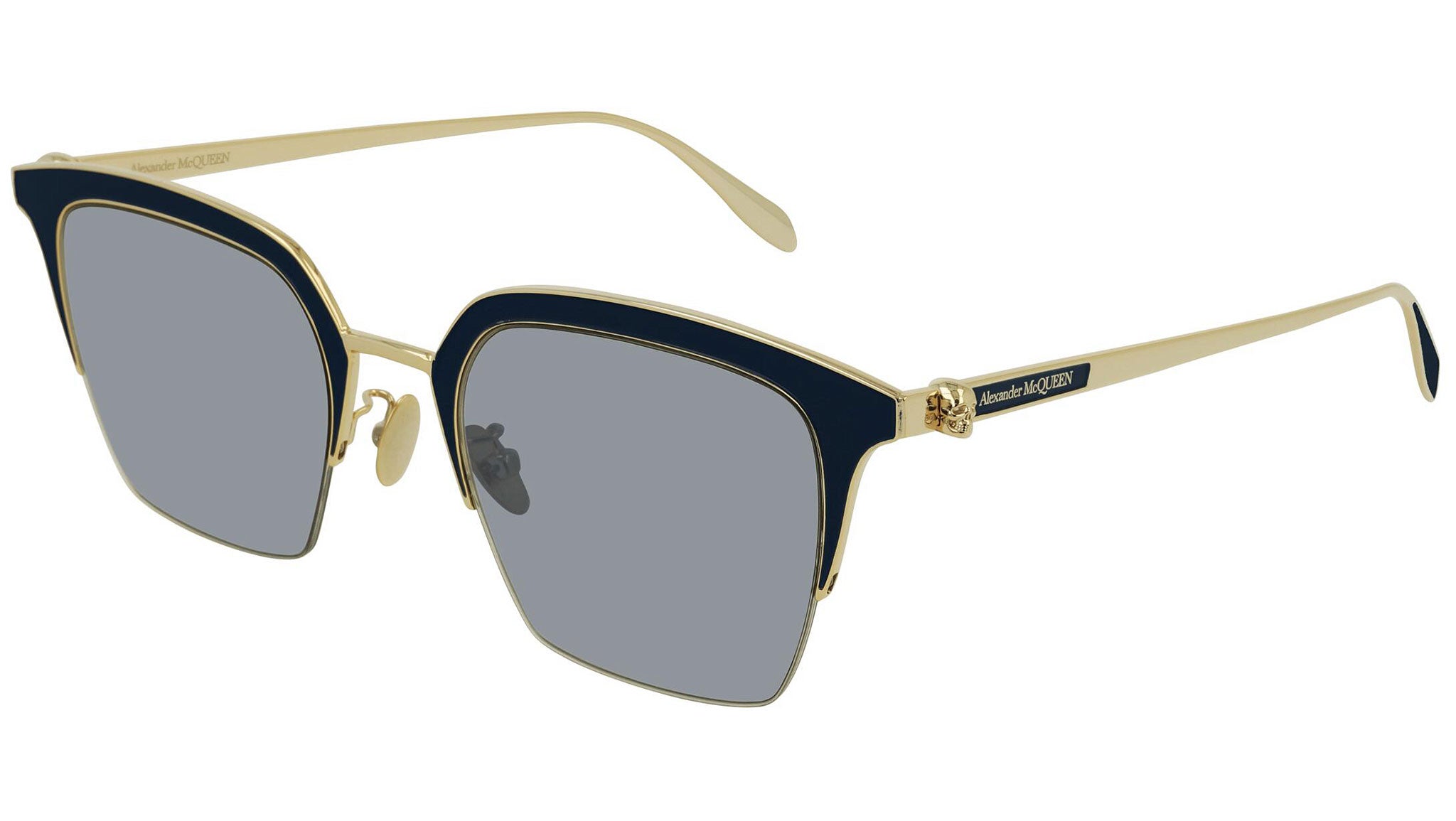 AM0213SA 004 sunglasses by Alexander McQueen with shiny light gold / dark blue frame and solid light grey lenses. Alexander McQueen Eyewear eyewear styles represent a juxtaposition between contrasting elements: femininity and masculinity, fragility and strength, tradition and modernity. An innovative and uncompromising identity of the fashion house.