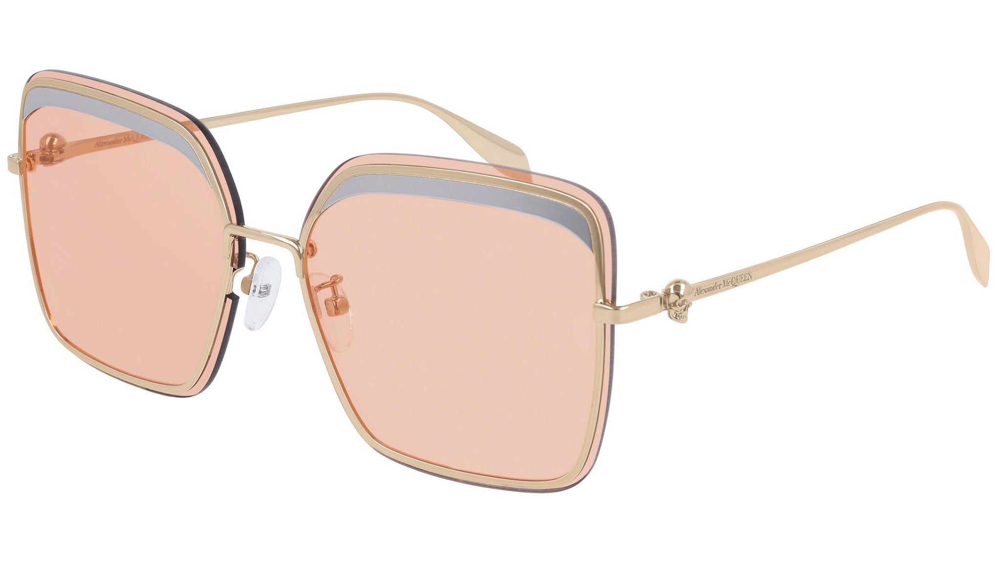 AM0222SK 004 sunglasses by Alexander McQueen with shiny rose gold / shiny light ruthenium frame and solid blush lenses. Alexander McQueen Eyewear eyewear styles represent a juxtaposition between contrasting elements: femininity and masculinity, fragility and strength, tradition and modernity. An innovative and uncompromising identity of the fashion house.