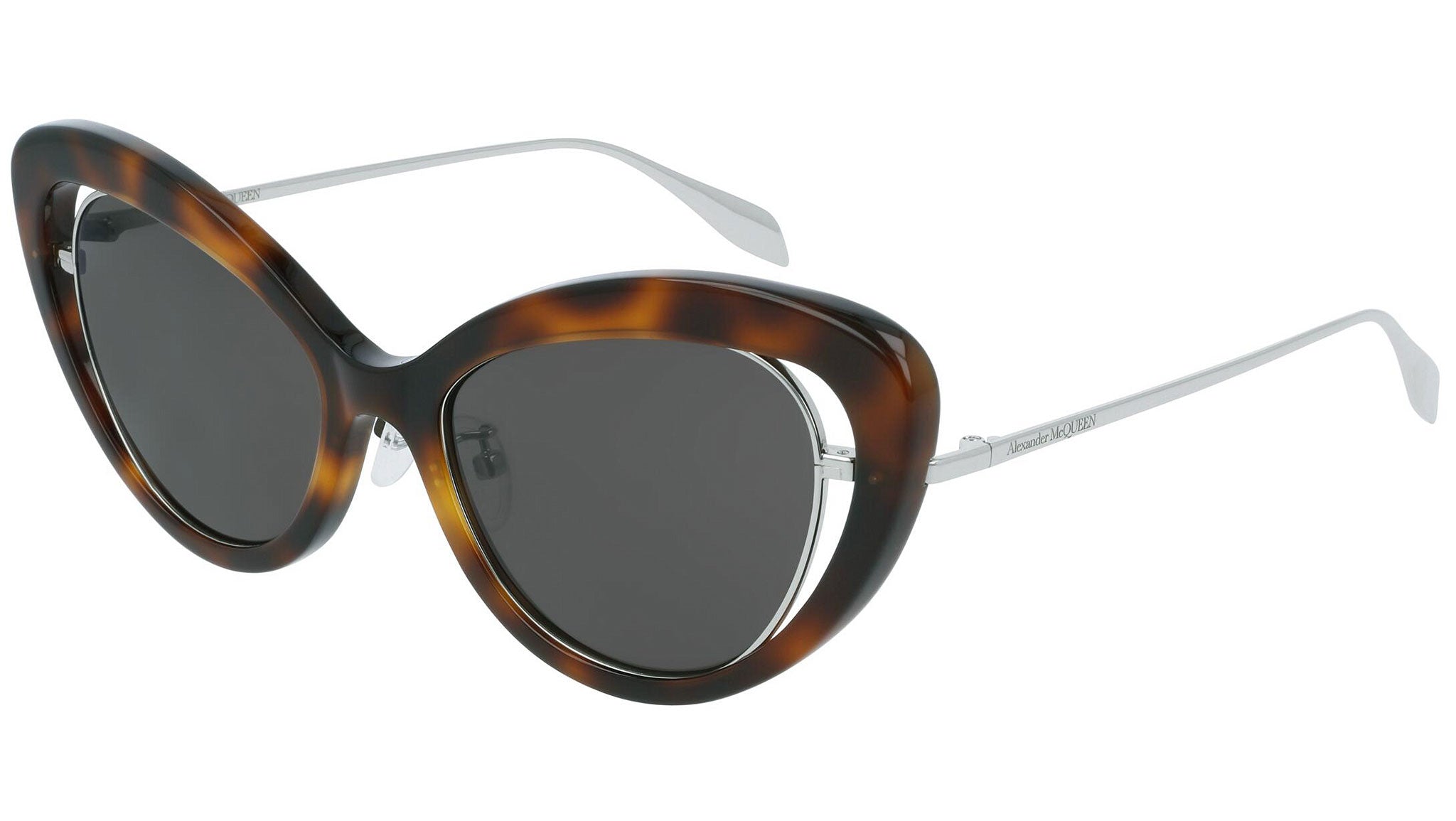 AM0223S 002 sunglasses by Alexander McQueen with shiny medium havana / shiny silver frame and solid grey lenses. Alexander McQueen Eyewear eyewear styles represent a juxtaposition between contrasting elements: femininity and masculinity, fragility and strength, tradition and modernity. An innovative and uncompromising identity of the fashion house.