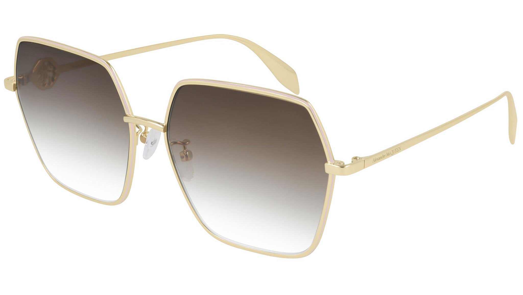 AM0226SK 002 sunglasses by Alexander McQueen with shiny light gold frame and gradient brown lenses. Alexander McQueen Eyewear eyewear styles represent a juxtaposition between contrasting elements: femininity and masculinity, fragility and strength, tradition and modernity. An innovative and uncompromising identity of the fashion house.