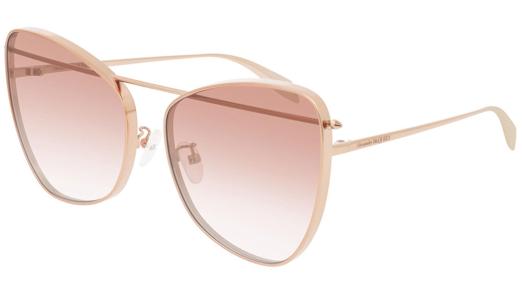 AM0228S 004 sunglasses by Alexander McQueen with shiny rose gold frame and gradient coral mask lenses. Alexander McQueen Eyewear eyewear styles represent a juxtaposition between contrasting elements: femininity and masculinity, fragility and strength, tradition and modernity. An innovative and uncompromising identity of the fashion house.