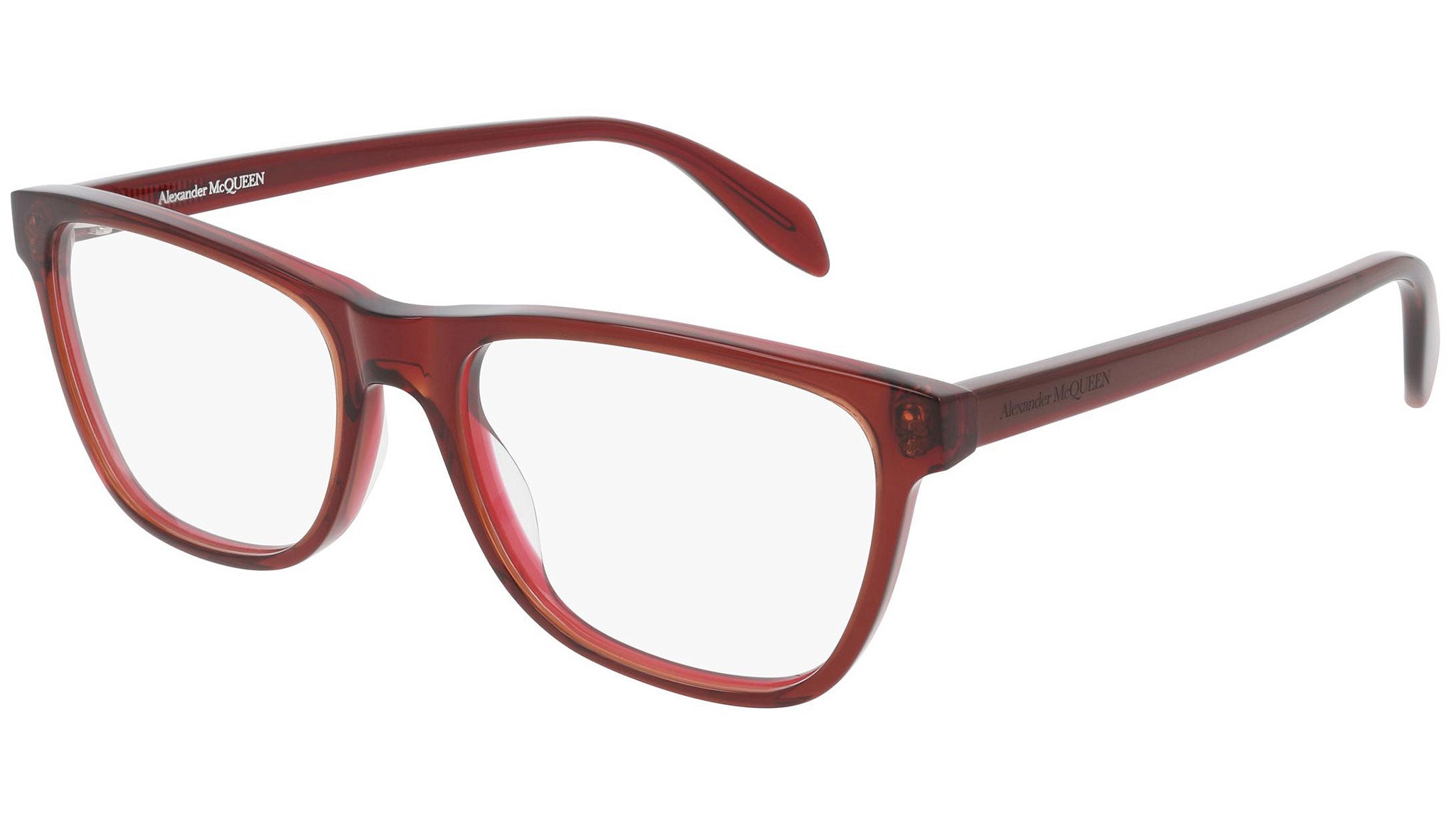 Alexander McQueen optical glasses model AM0248O 004 featuring shiny bilayer transparent red / orange frame. Synonymous with fearless fashion, Alexander McQueen Eyewear eyewear styles represent a juxtaposition between contrasting elements, as his runway styles are unique and inspiring. Buy your frames online and take them to your local optician to fit prescription lenses.