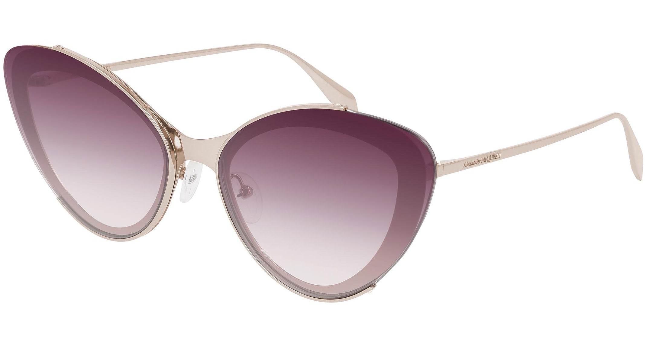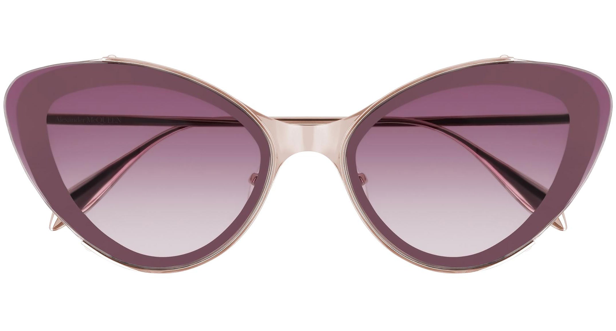 Alexander McQueen Edge sunglasses collection model AM0251S 003 featuring shiny rose gold frame and gradient burgundy lens. Alexander McQueen eyewear styles represent a juxtaposition between contrasting elements: femininity and masculinity, fragility and strength, tradition and modernity. An innovative and uncompromising identity of the fashion house.