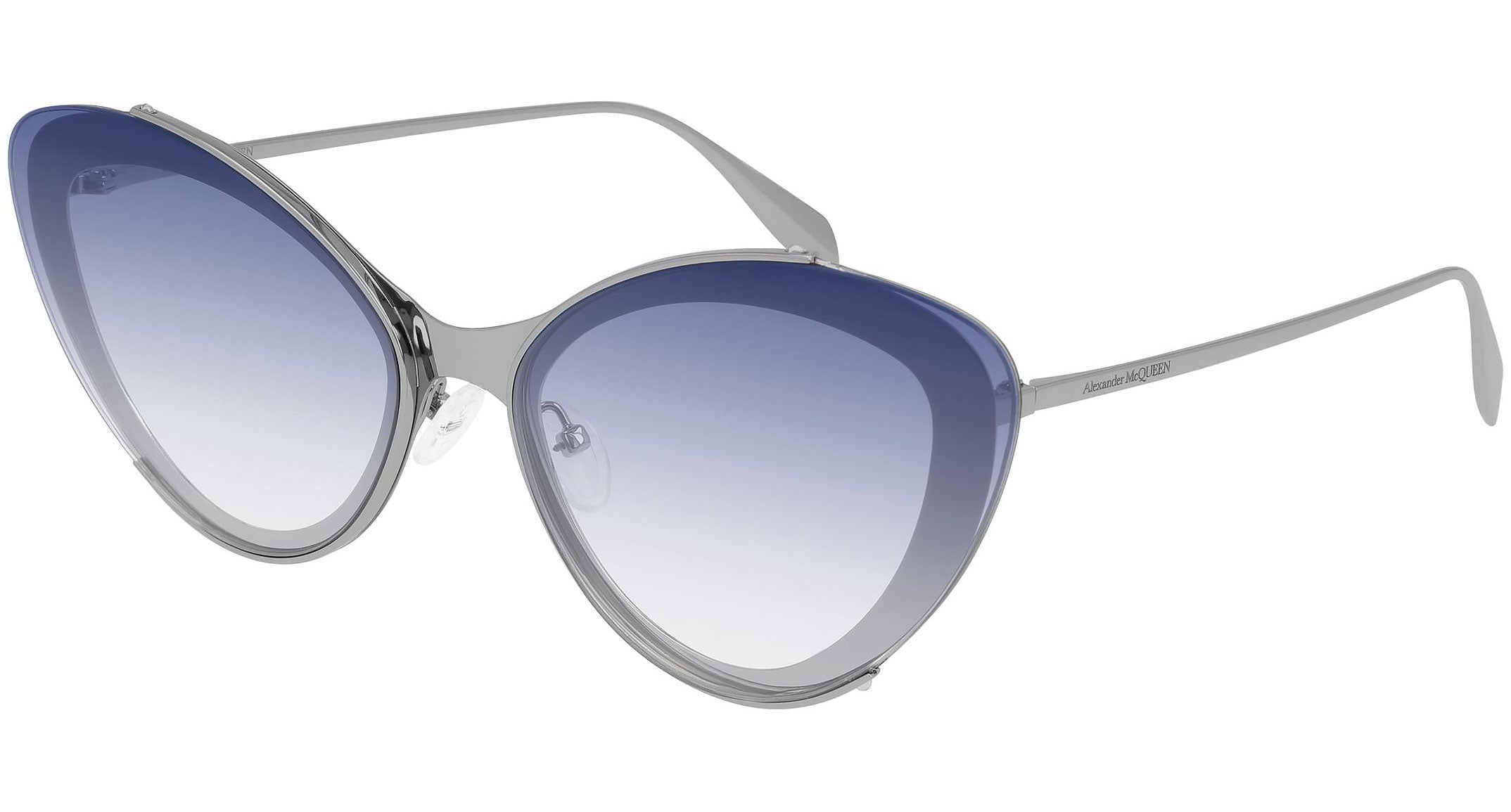 Alexander McQueen Edge sunglasses collection model AM0251S 004 featuring shiny light ruthenium frame and gradient violet blue lens. Alexander McQueen eyewear styles represent a juxtaposition between contrasting elements: femininity and masculinity, fragility and strength, tradition and modernity. An innovative and uncompromising identity of the fashion house.