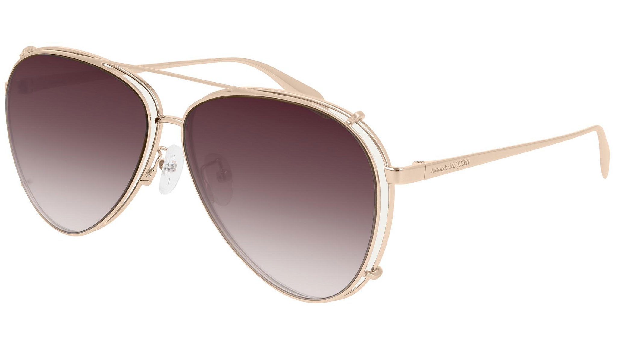 AM0263S 004 sunglasses by Alexander McQueen with shiny rose gold frame and solid light yellow + gradient bordeaux lens on clip on lenses. Alexander McQueen Eyewear eyewear styles represent a juxtaposition between contrasting elements: femininity and masculinity, fragility and strength, tradition and modernity. An innovative and uncompromising identity of the fashion house.