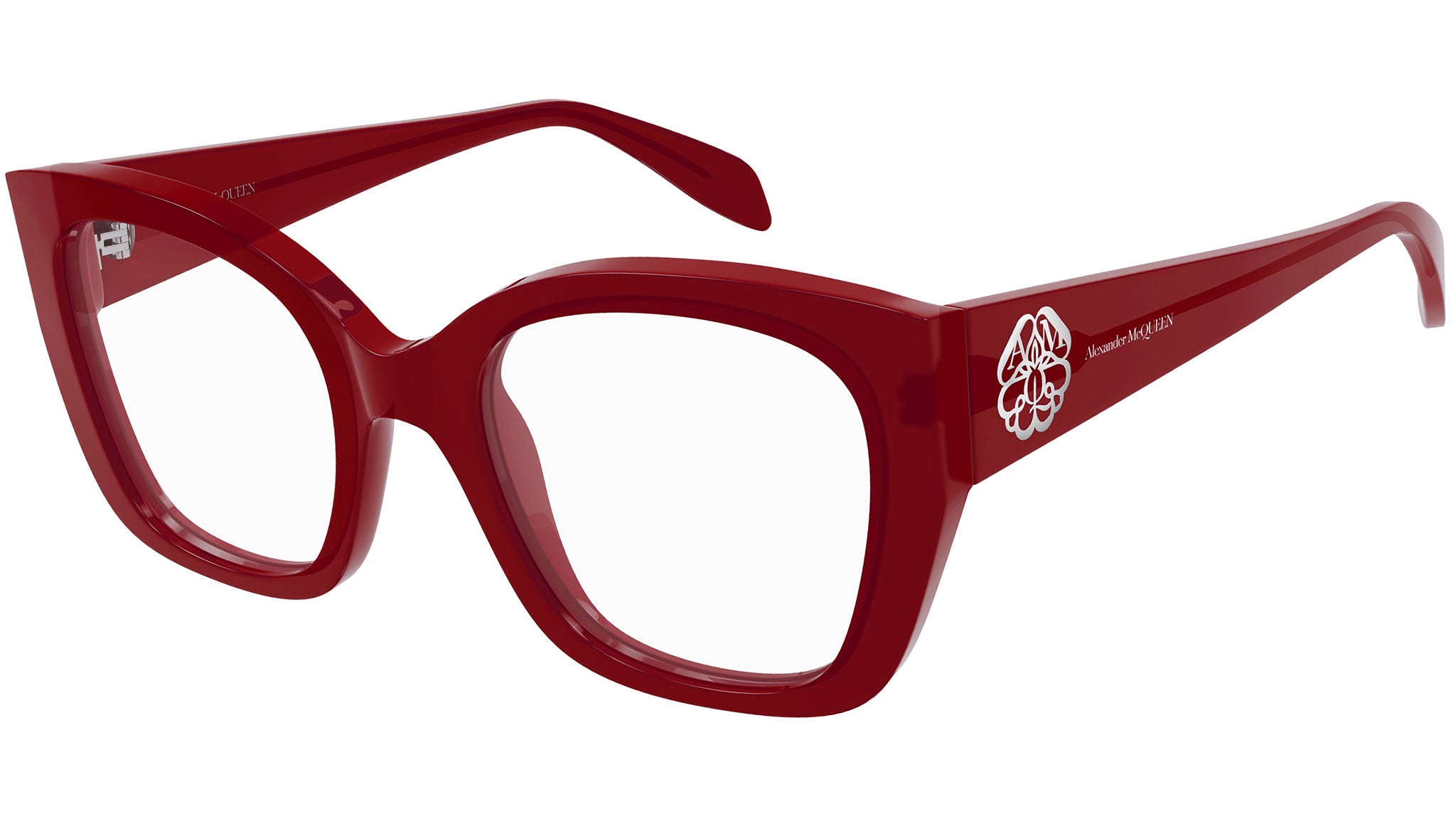 Occhiali da vista Alexander McQueen linea Icons modello AM0379O variante colore 003 bordeaux opalino lucido con astine color rosso.