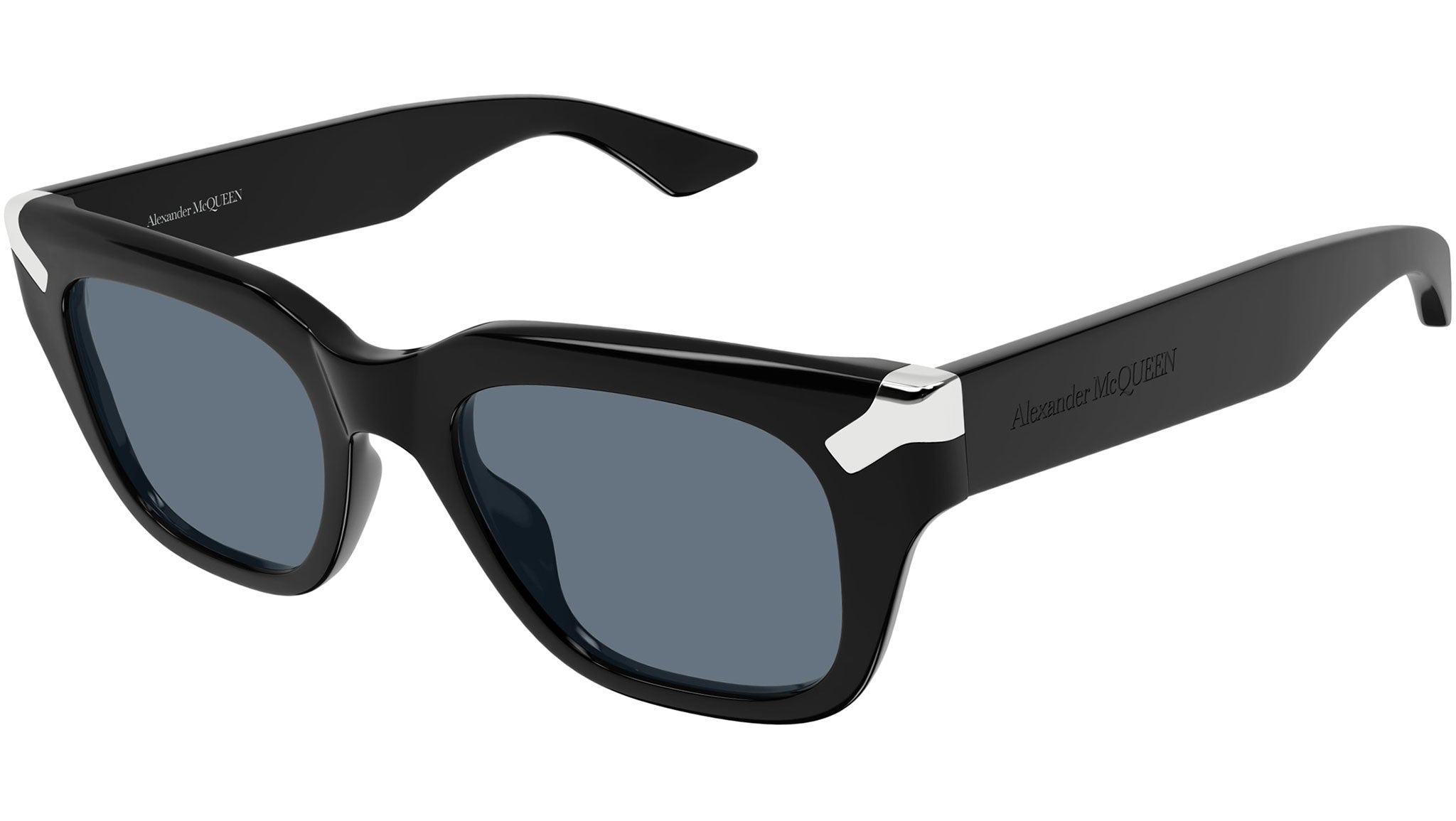 Occhiali da sole Alexander McQueen Icons modello AM0439S rectangle in acetato riciclato codice colore 002 nero lucido tinta unita con aste nero e lenti color blu tinta unita.