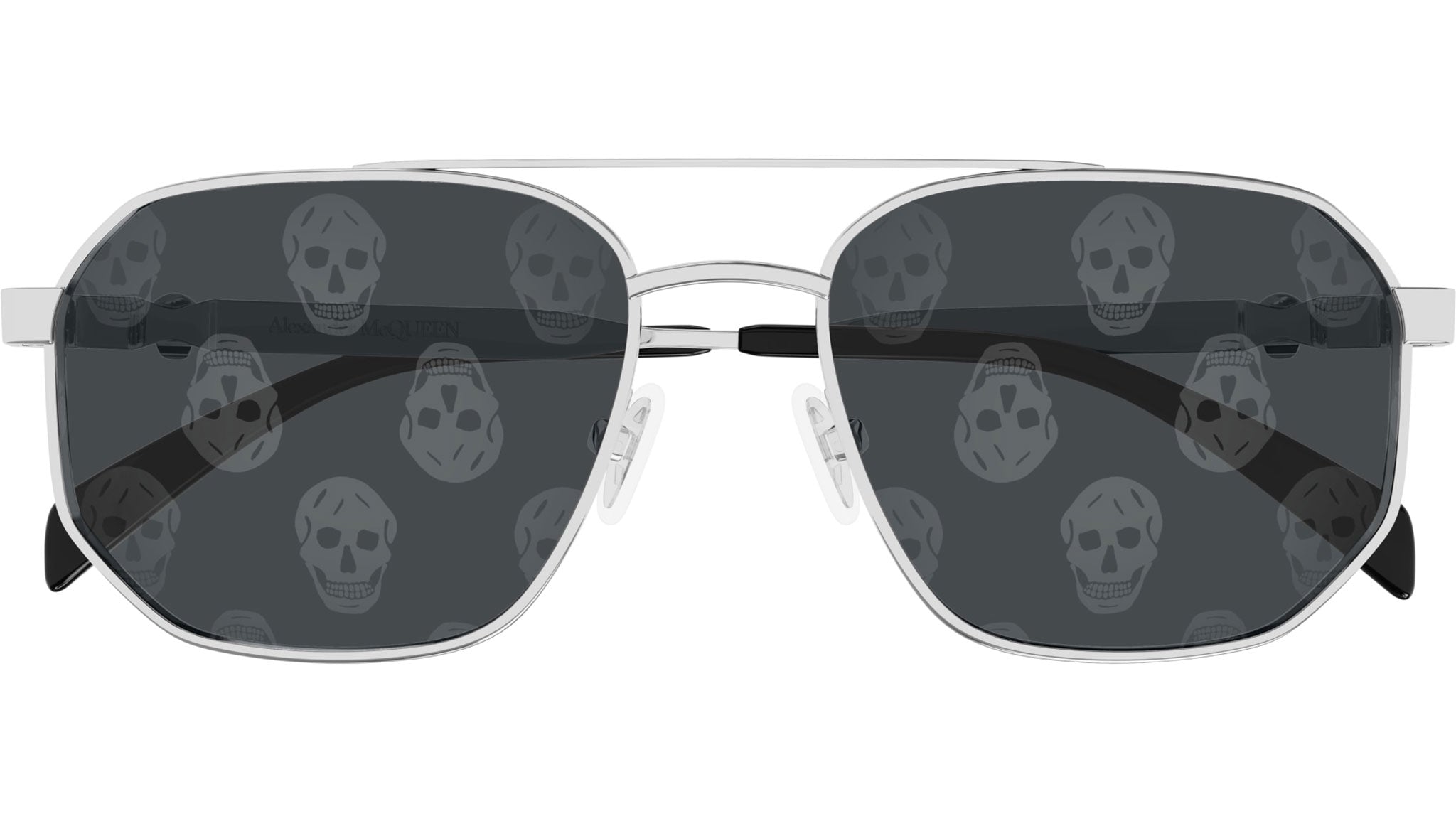 Occhiali da sole Alexander McQueen Icons modello AM0458S aviator in metallo codice colore 004 argento lucido con aste argento e lenti color grigio solido + pattern teschi argento specchiato.