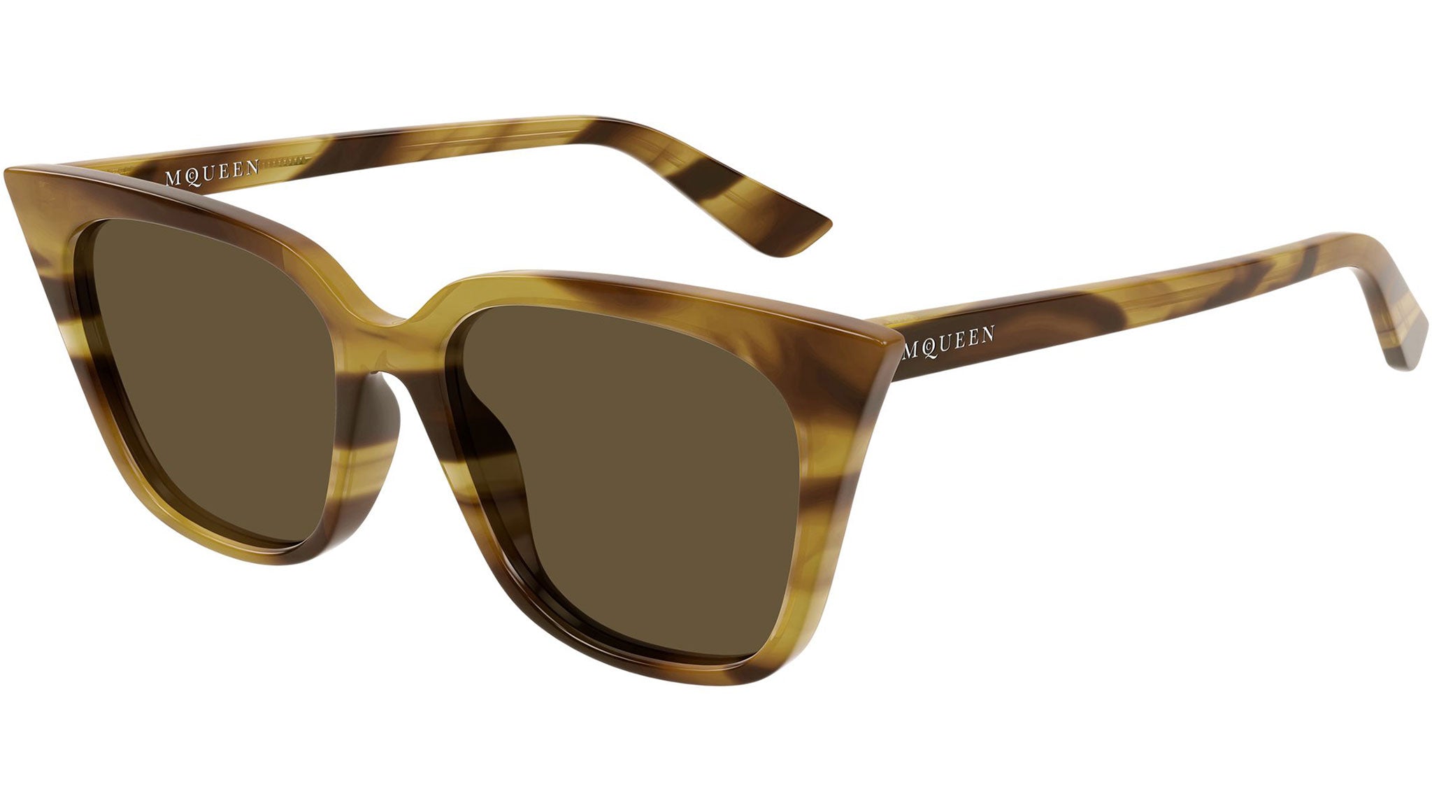Occhiali da sole Alexander McQueen AM0556S 003 donna con montatura cat eye in acetato riciclato avana giallo rigato lucido e lenti marrone tinta unita. Linea: Logo. Codice modello: AM0556S. Codice colore: 003. Made in Italy. Rivenditore autorizzato Alexander McQueen online. Gli occhiali vengono consegnati con custodia e accessori originali e sono coperti dalla garanzia ufficiale di 12 mesi del produttore.