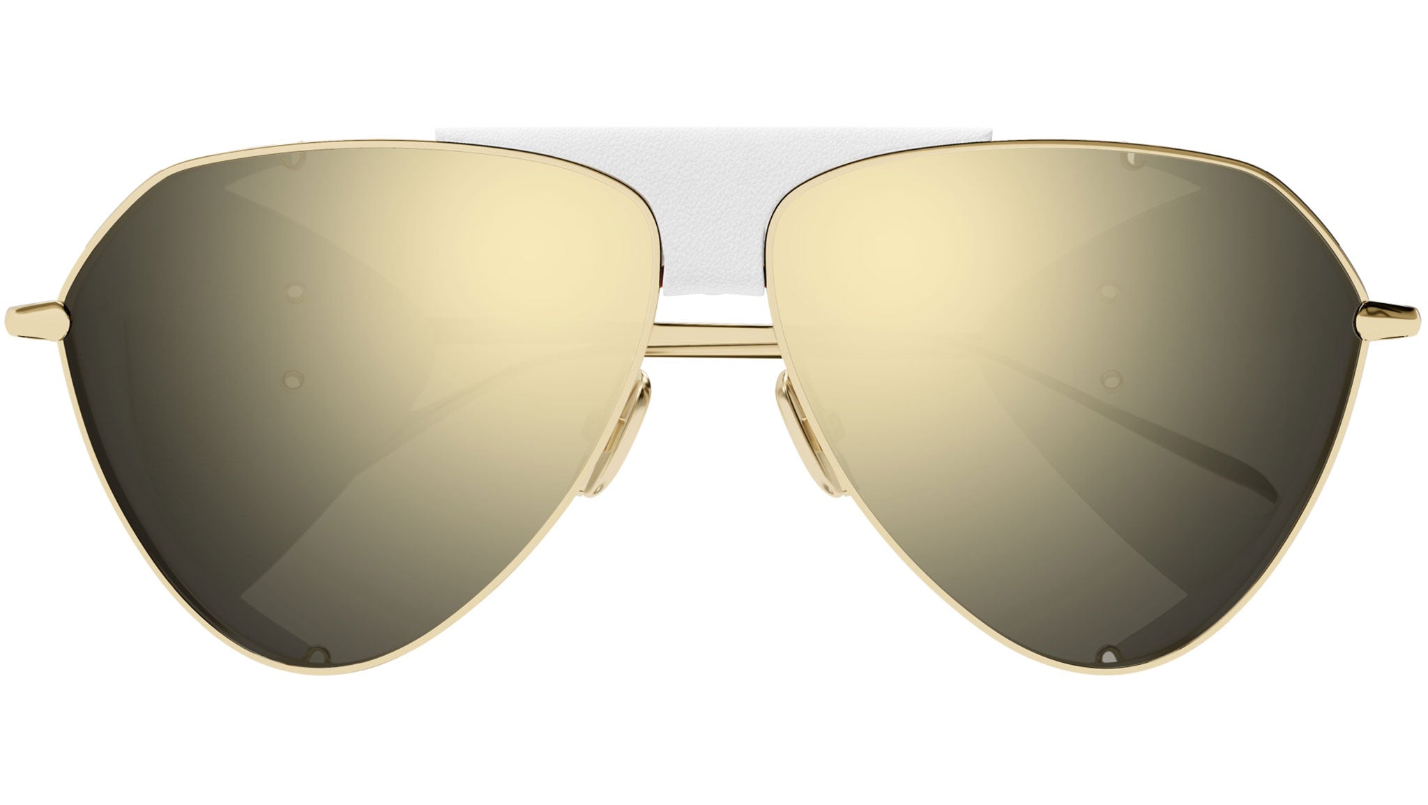 Occhiali da sole Azzedine Alaïa modello AA0067S variante colore 002 oro metallico chiaro / cover pelle bianca con lenti color grigio tinta unita + multilayer avorio.