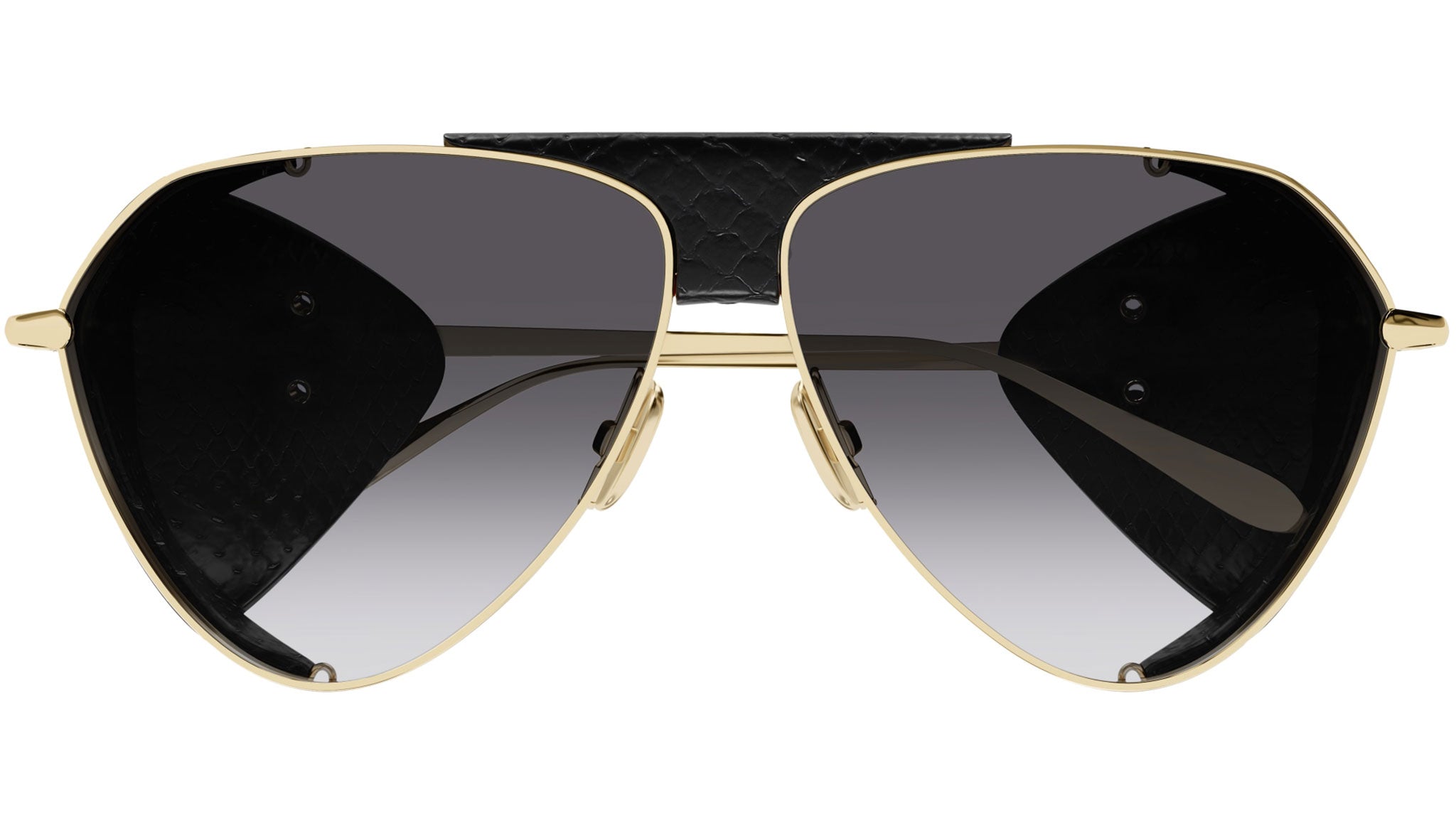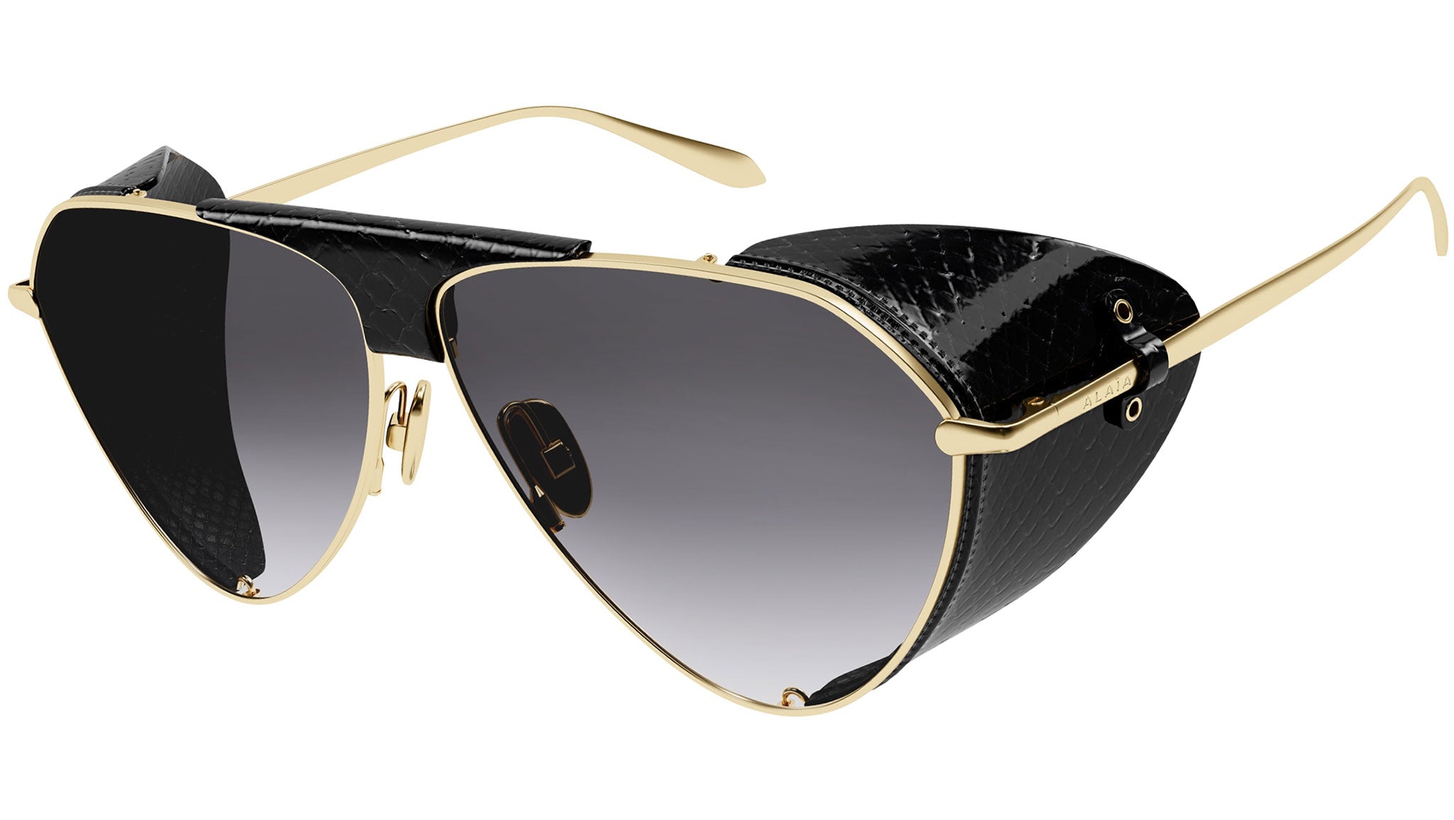 Occhiali da sole Azzedine Alaïa modello AA0067S variante colore 004 oro metallico chiaro / cover ayers nero con lenti color grigio sfumato.