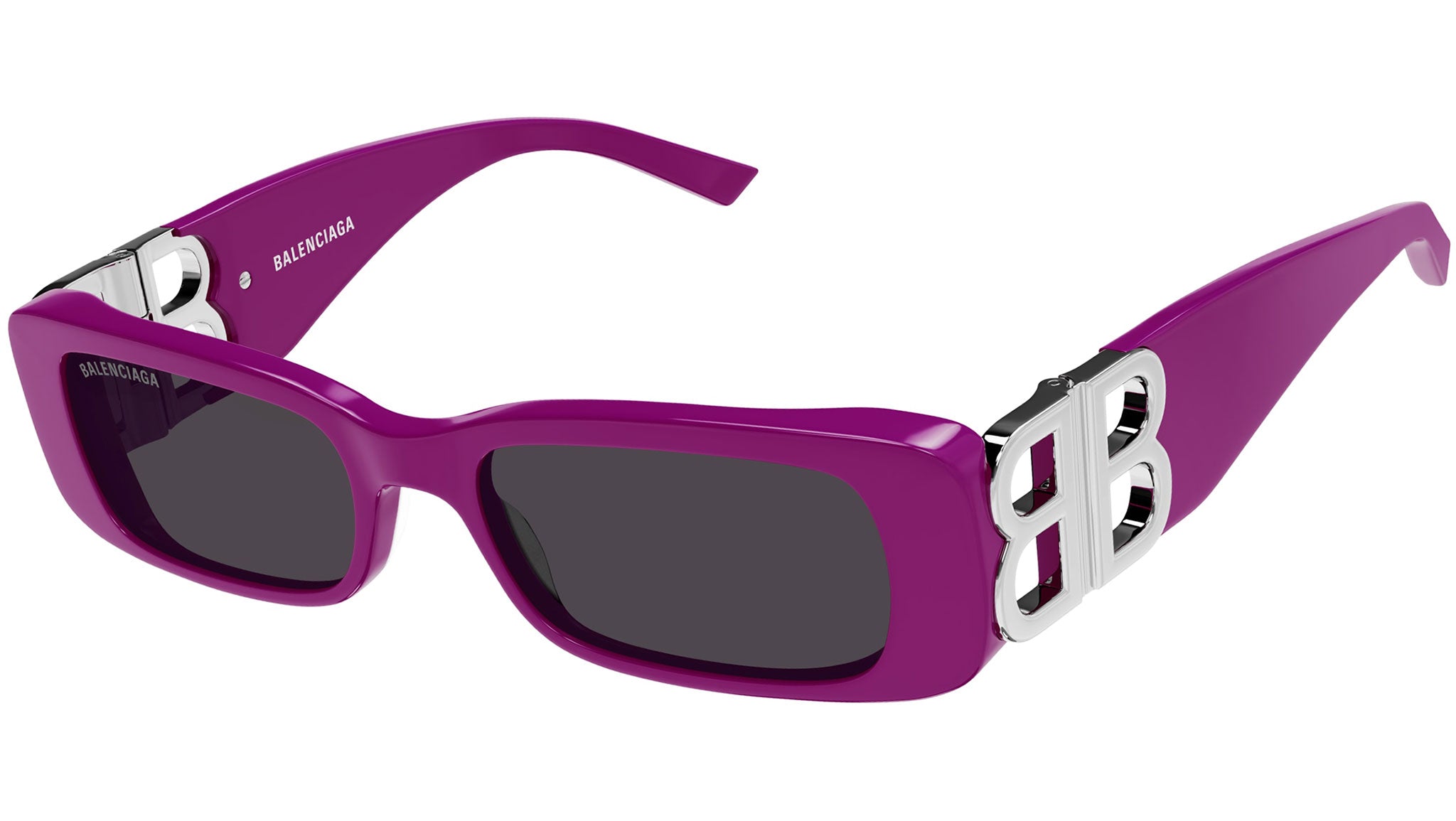 Occhiali da sole Balenciaga linea Everyday BB0096S codice colore 016 con montatura fuchsia tinta unita lucido e lenti color grigio tinta unita.