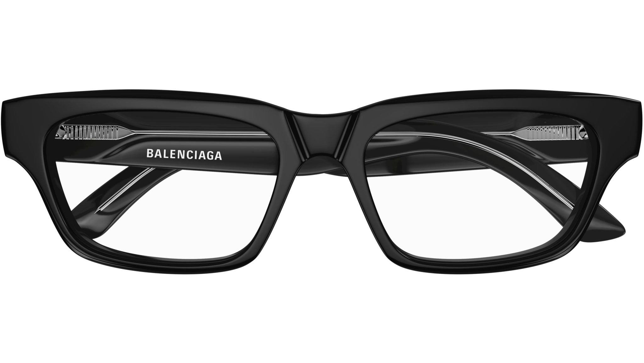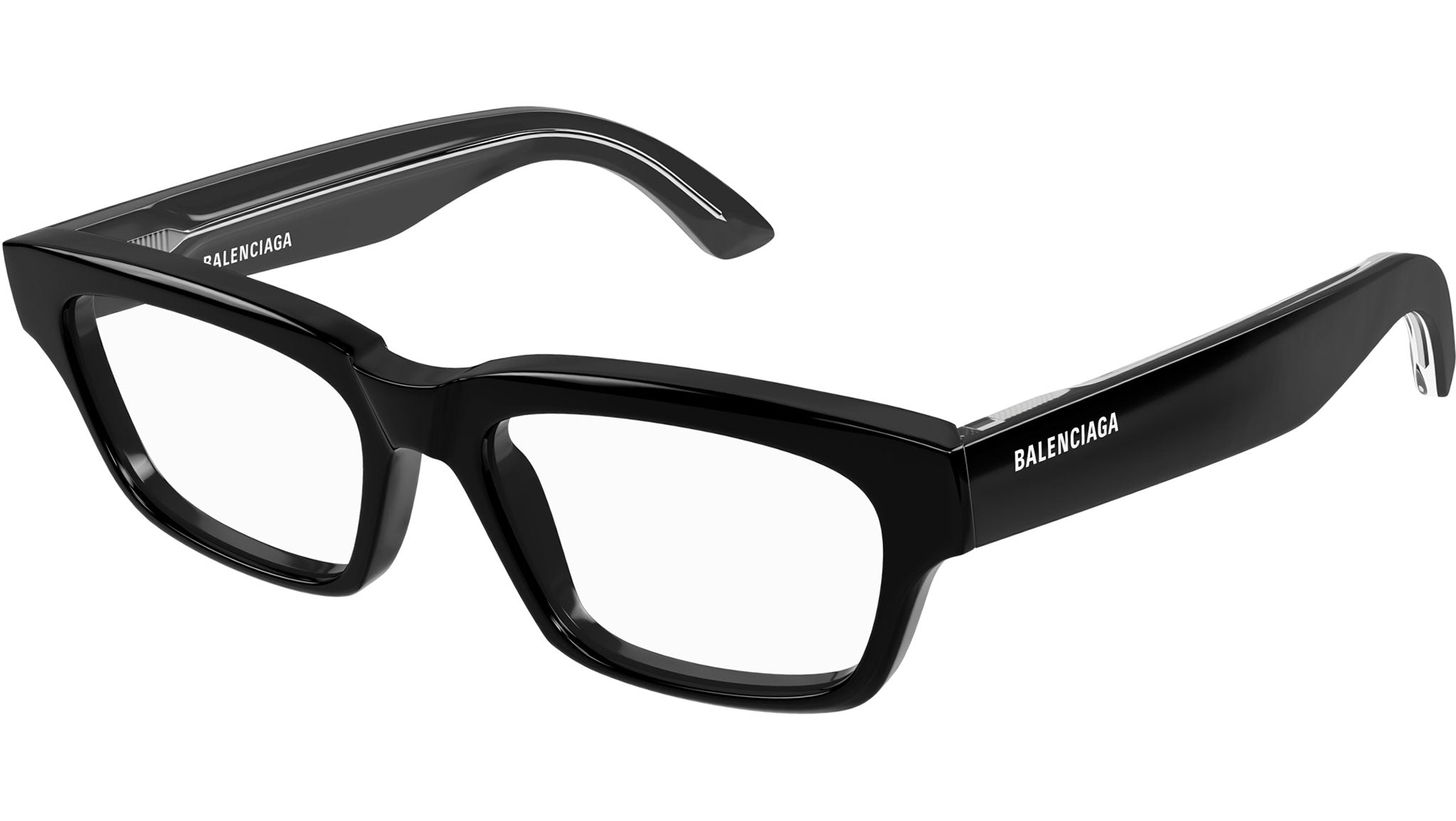 Occhiali da vista Balenciaga modello BB0344O linea Everyday codice colore 001 nero lucido tinta unita in acetato riciclato forma rectangle con aste color nero.