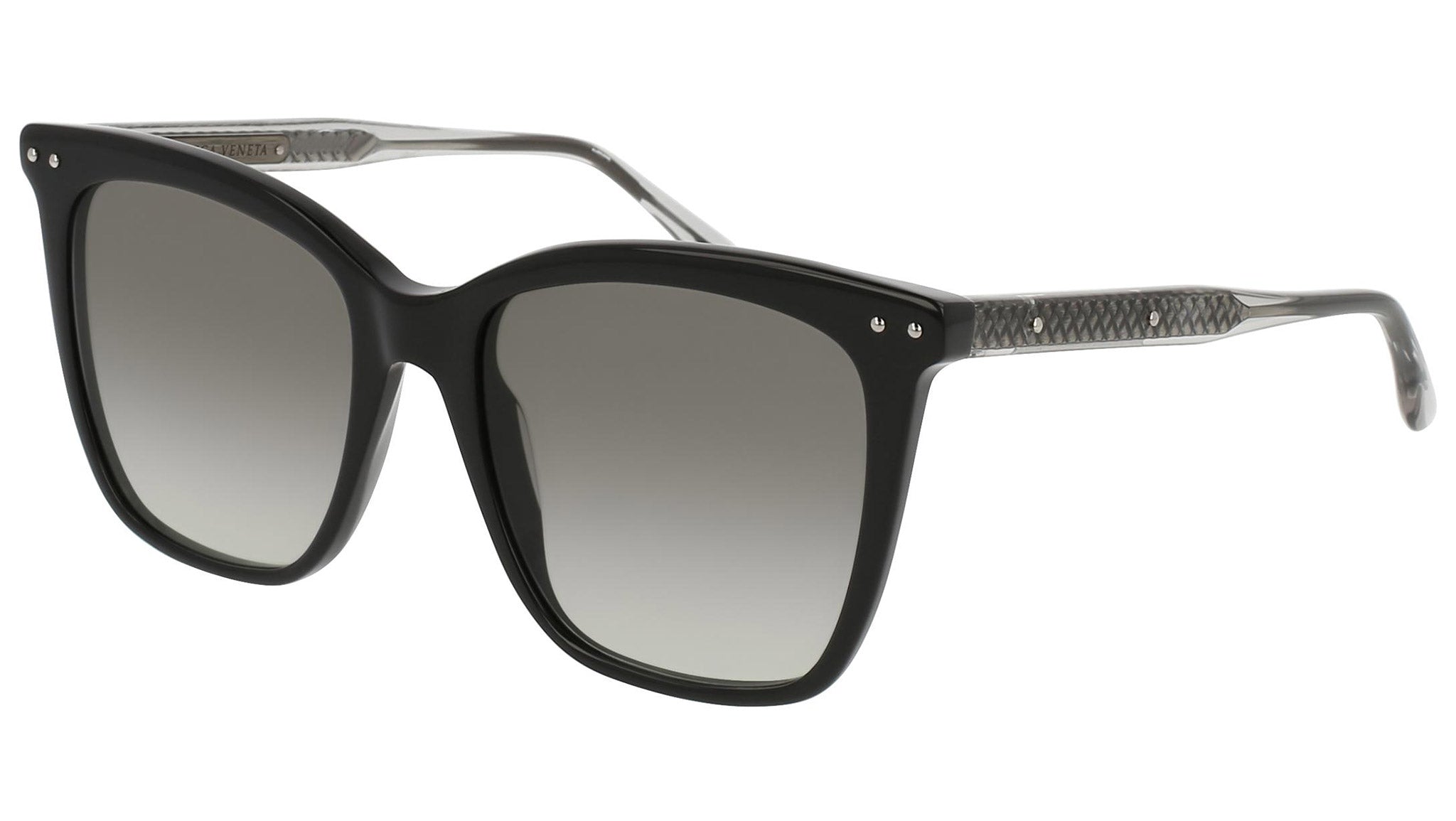 Bottega Veneta sunglasses collection model 0097S 004 featuring shiny black front frame and gradient grey lens. Inspired by Italian culture with a global outlook, the House is defined by a distinctly refined attitude. Bottega Veneta uses noble materials to create considered pieces that become part of their owner’s lives.