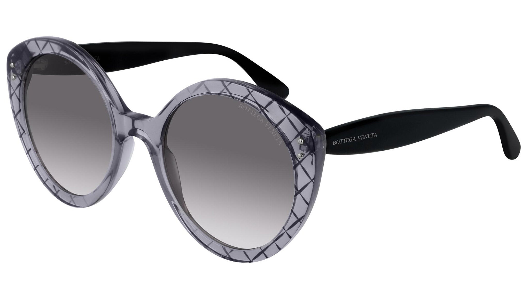 Bottega Veneta sunglasses collection model 0234S 001 featuring shiny transparent grey + serigraphy front frame and gradient grey lens. Inspired by Italian culture with a global outlook, the House is defined by a distinctly refined attitude. Bottega Veneta uses noble materials to create considered pieces that become part of their owner’s lives.