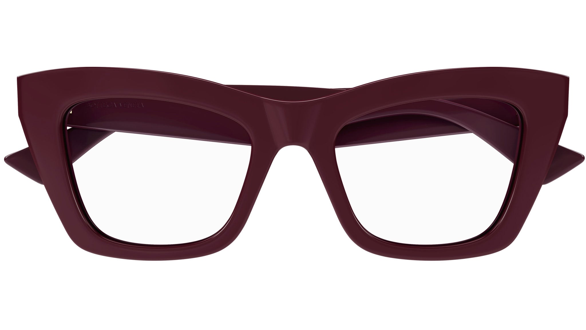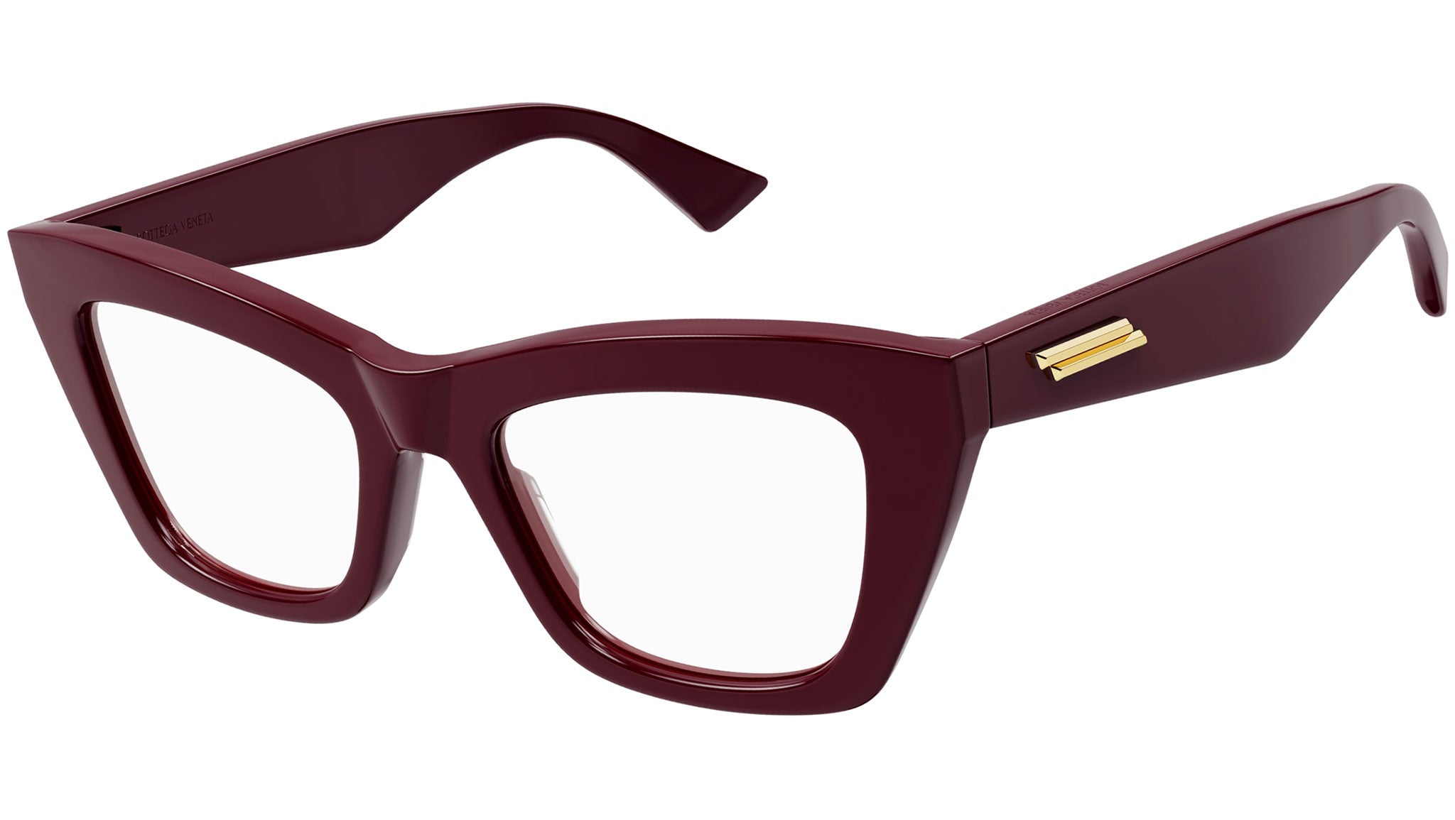 Occhiali da vista Bottega Veneta linea New Classic modello BV1215O 004 variante colore bordeaux tinta unita lucido con astine color rosso borgogna.