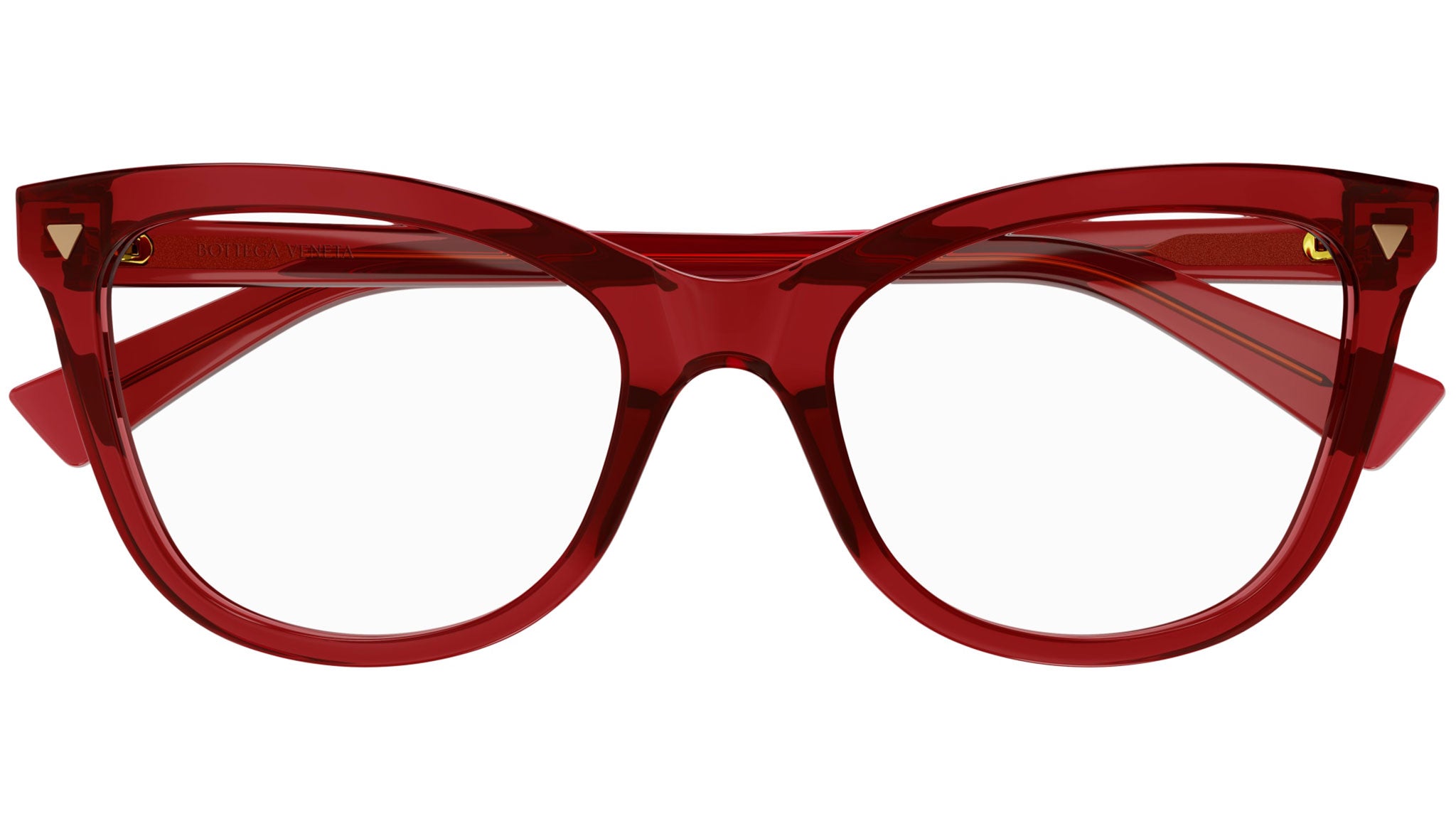 Occhiali da vista Bottega Veneta linea New Classic modello BV1226O variante colore borgogna trasparente lucido con astine color rosso borgogna.