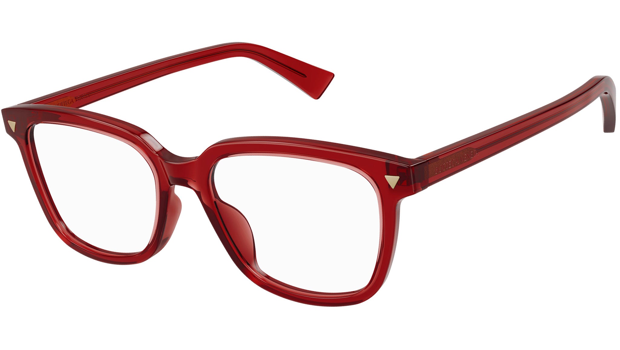 Occhiali da vista Bottega Veneta linea New Classic modello BV1229OA 004 variante colore borgogna trasparente lucido con astine color rosso borgogna.