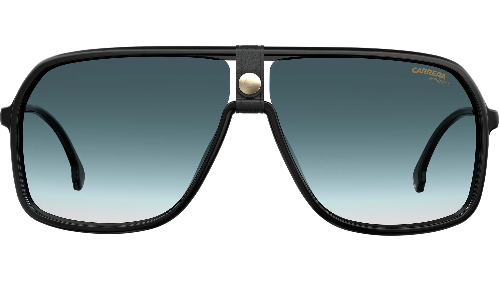 Rivisitazione dei classici occhiali da sole aviator proposta da Carrera per la nuova stagione, questo design dai forti contrasti combina frontale e terminali in acetato nero con aste in elegante metallo color oro per uno stile audace e accattivante. Le lenti sfumate blu, così come l’iconico logo-C Carrera applicato su un dettaglio in pelle fieramente posizionato sul fronte e al centro, giocano il loro fattore alla moda.