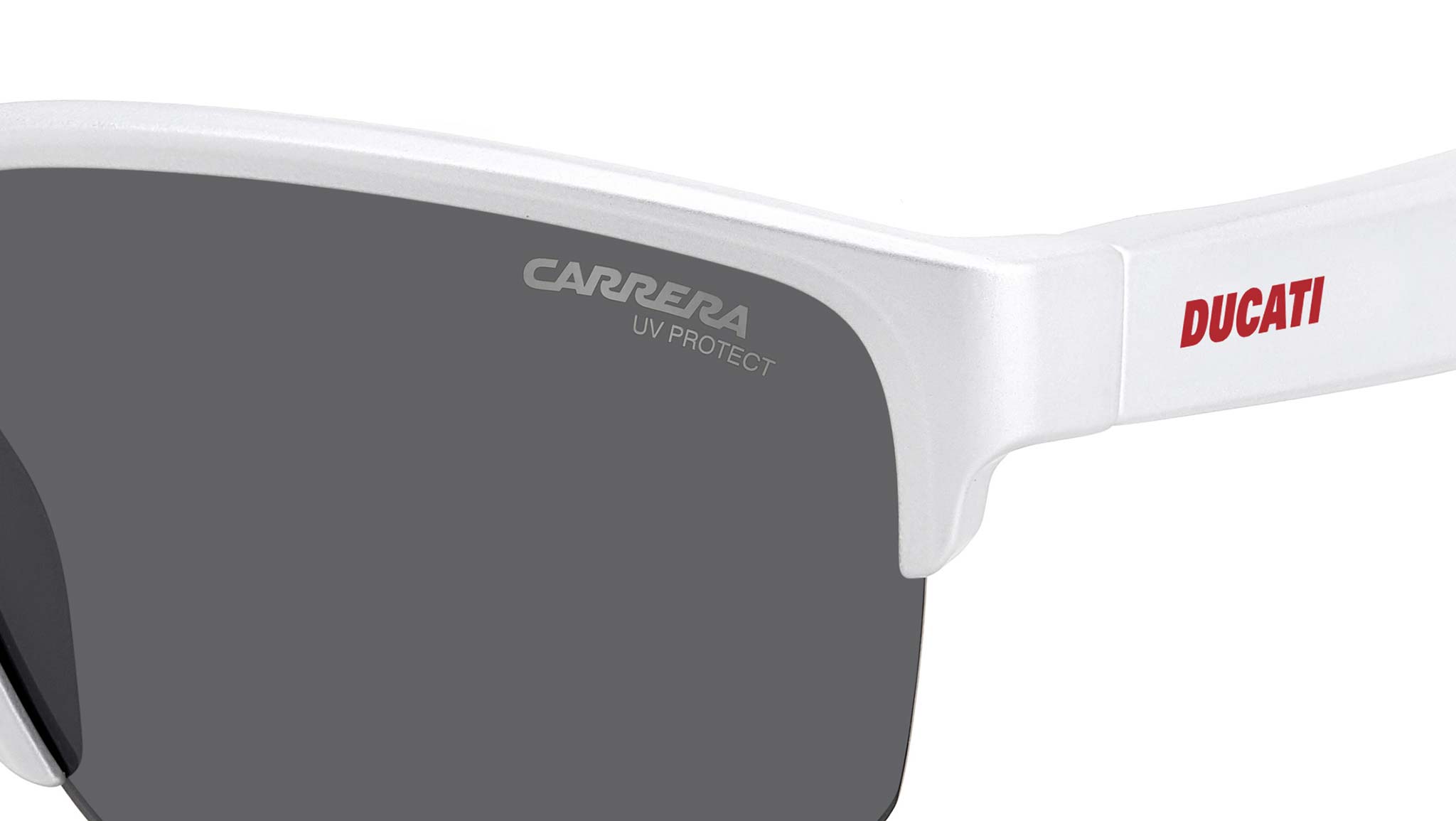 Occhiali da sole Carrera Ducati modello CarDuc 028/S colore 6HT IR matte white. La passione per la velocità su due ruote si esprime con questi occhiali da sole Carrera | Ducati. Le aste aerodinamiche omaggiano la Panigale, il loro design diritto e i terminali in gomma lucida facilitano l’utilizzo sotto il casco. Il frontale a mezza montatura è disponibile anche con lenti specchiate o con tecnologia ultrapolar, per una visione definita anche su strada.