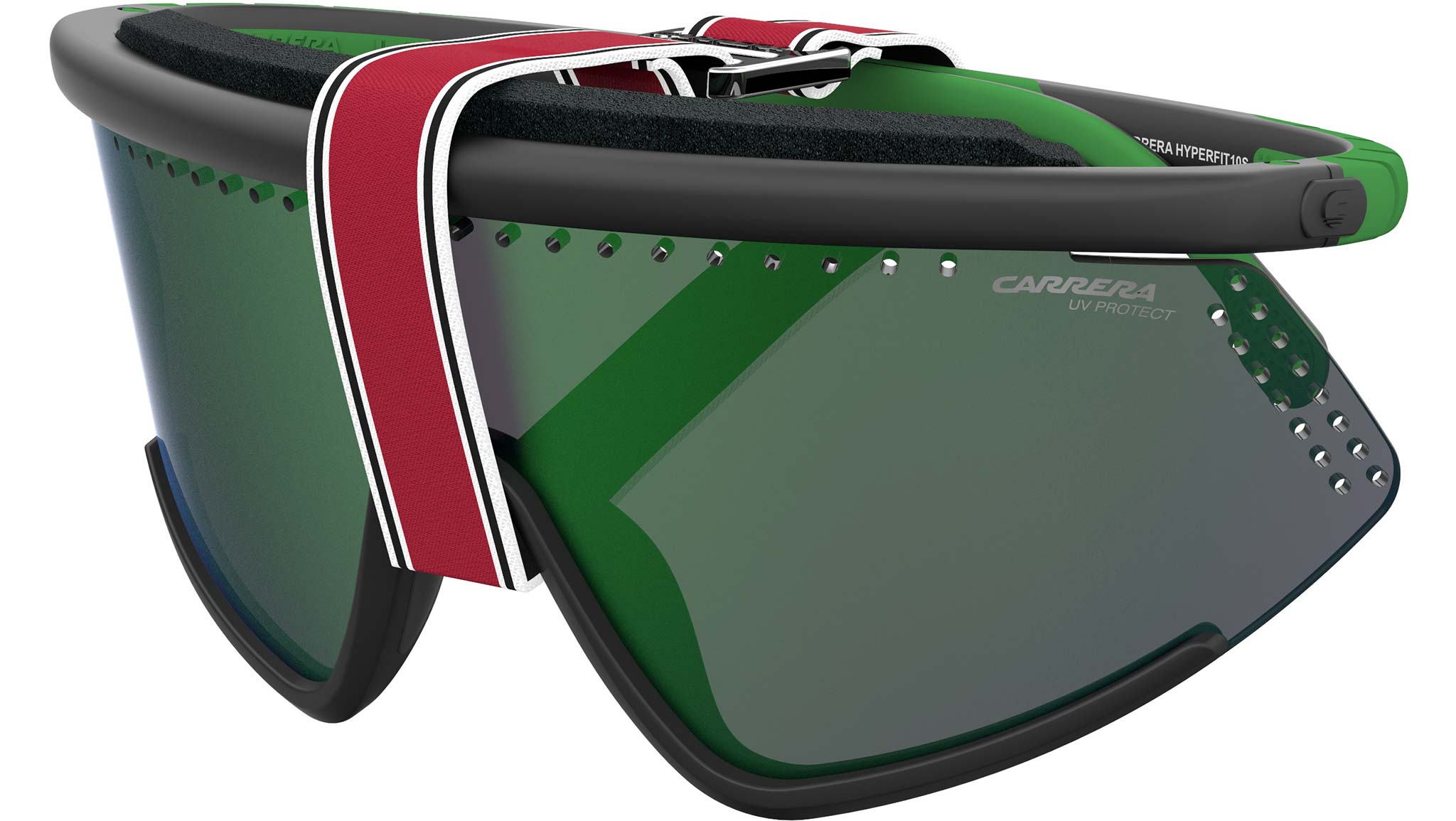 Questi occhiali da sole unisex trovano il perfetto equilibrio tra estetica e funzionalità, grazie alla silhouette parzialmente rimless e una serie di dettagli unici, volti a massimizzare la performance. La montatura pantos super leggera è scolpita in poliammide stampata a iniezione e dotata della barra superiore in schiuma, le lenti UV con una lavorazione perforata e i naselli in gomma per un fit antiscivolo. Le rivoluzionarie cerniere HyperFit assicurano libertà di movimento e flessibilità in ogni circostanza, mentre l'iconico logo sulle aste e sulla lente sinistra aggiunge una nota esclusiva. Il tocco finale è dato dal braccialetto complementare con l’iconica bandiera Carrera a righe bianche e rosse.