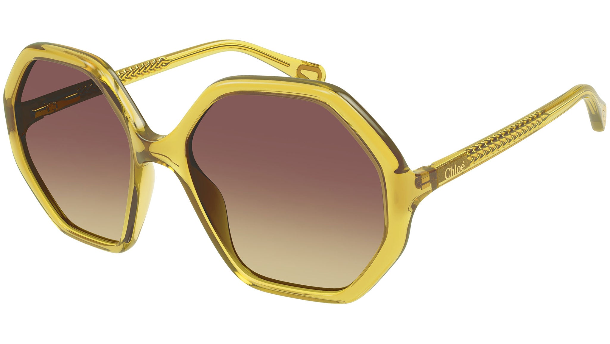 Occhiali da sole Chloé modello CC0004S variante colore 005 giallo senape trasparente lucido con lenti color marrone doppia sfumatura a giallo.