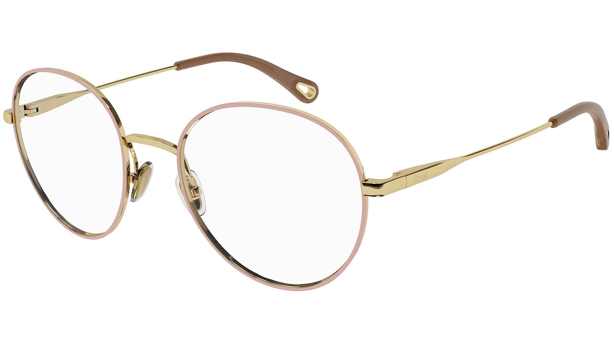 Occhiali da vista Chloé modello 0021O, variante colore 009 nude tinta unita lucido con astine color oro.