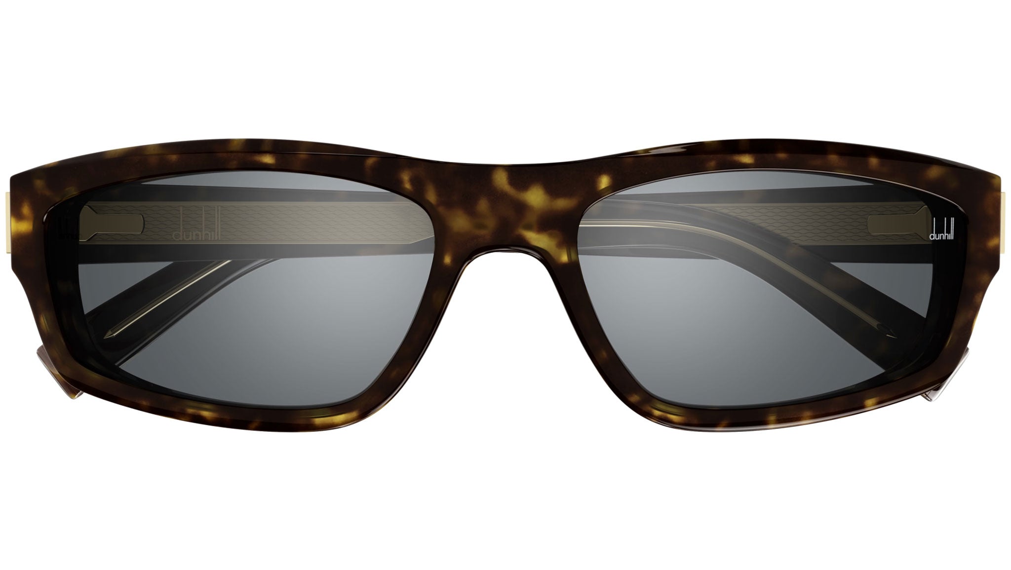 Occhiali da sole Dunhill modello DU0077S linea Eyewear forma rettangolare in acetato riciclato, codice colore 002 tartaruga scuro lucido con aste color tartaruga e lenti color argento + grigio tinta unita.