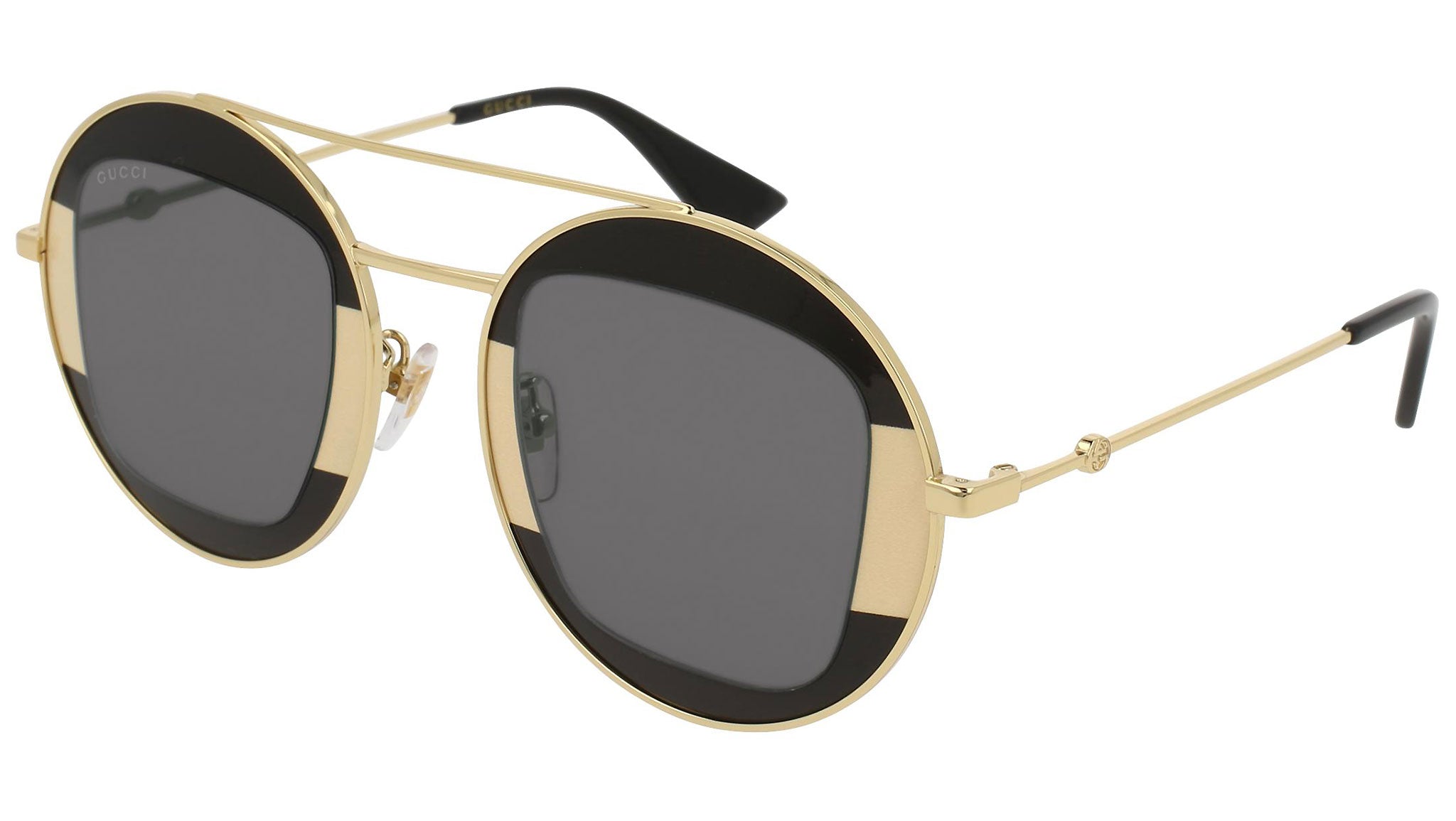 Occhiali da sole Gucci GG0105S 006 con montatura nero lucido-avorio e oro endura lucido e lenti color grigio. Eclettici, moderni, romantici: i prodotti Gucci Eyewear rappresentano la punta di diamante dell'artigianalità italiana, in quanto a qualità e attenzione ai dettagli. Innovativo, prestigioso e audace, Gucci sta reinventando un approccio alla moda totalmente moderno. Nella sua nuova vision creativa, la Maison ha redifinito il concetto di lusso per il 21mo secolo.