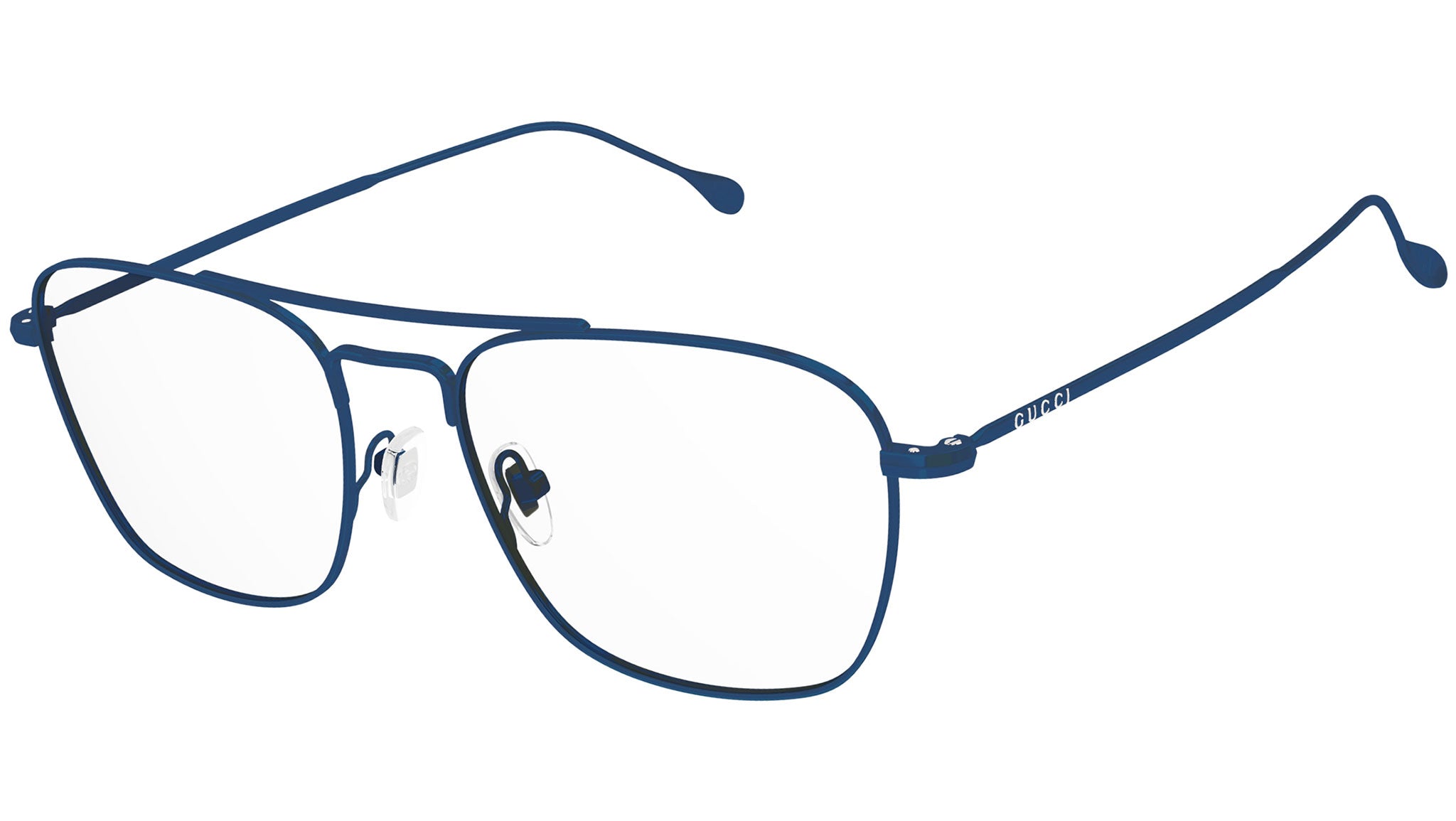 Occhiali da vista linea Gucci Logo modello GG1183O variante colore 001 blu scuro effetto vernice con astine color blu.