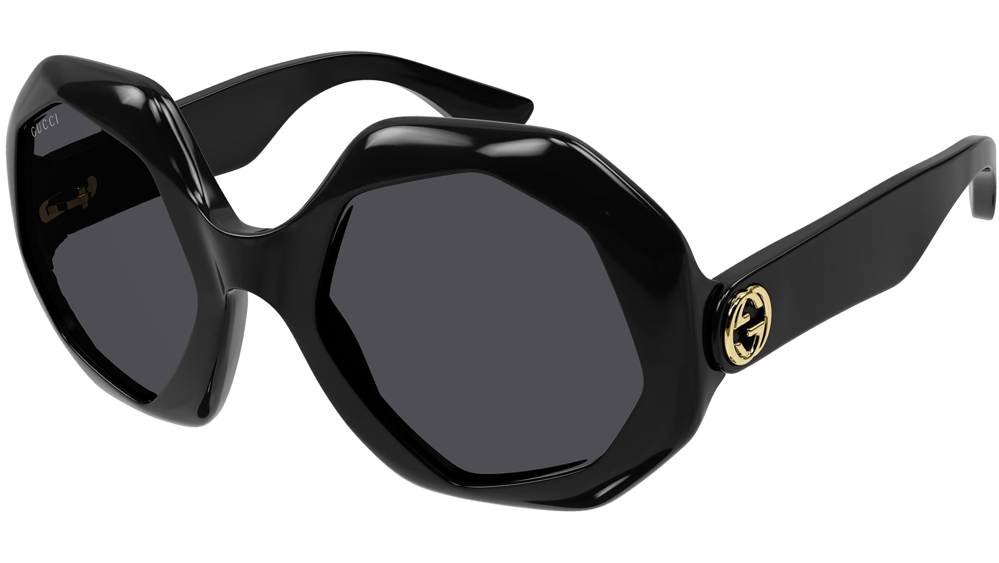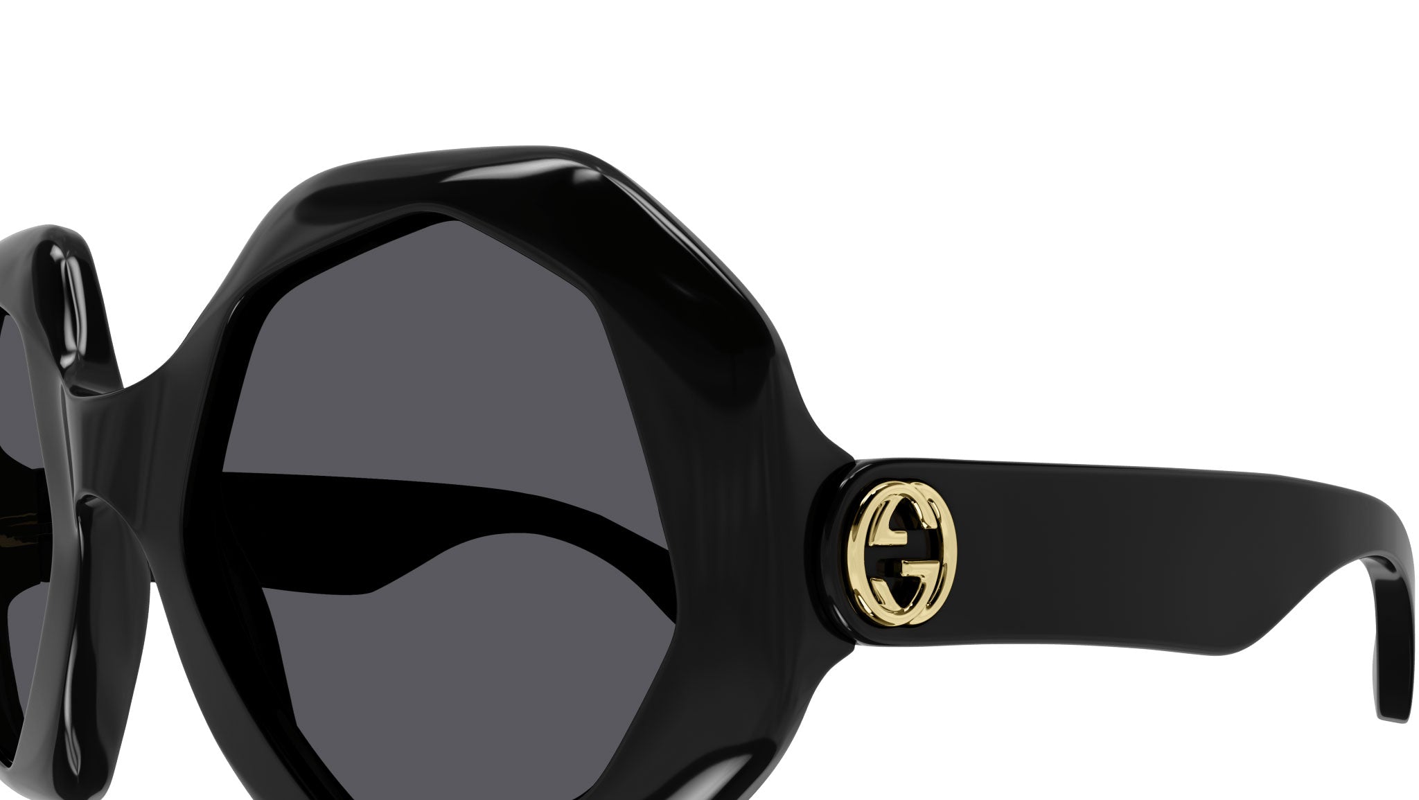 Occhiali da sole Gucci Logo modello GG1242S variante colore 001 nero lucido con lenti color grigio tinta unita.