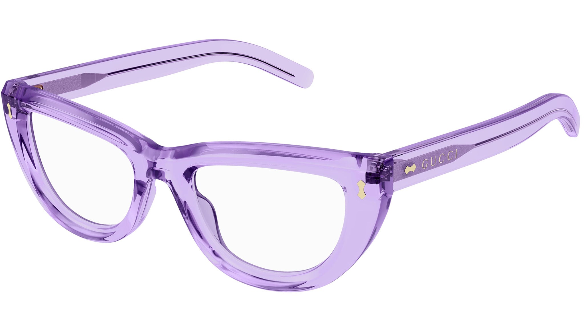 Occhiali da vista Gucci Rivets modello GG1521O cat eye in acetato riciclato codice colore 004 lilla chiaro trasparente lucido con astine viola e lenti demo.