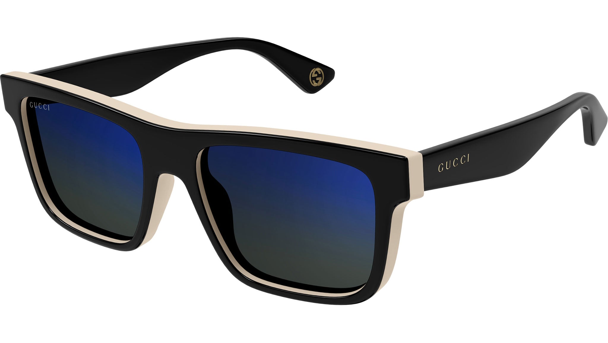 Occhiali da sole Gucci linea Lettering modello GG1618S rettangolari in acetato riciclato codice colore 003 doppio strato nero lucido tinta unita e avorio con aste nero e lenti color verde scuro solido + blu sfumato a specchio.