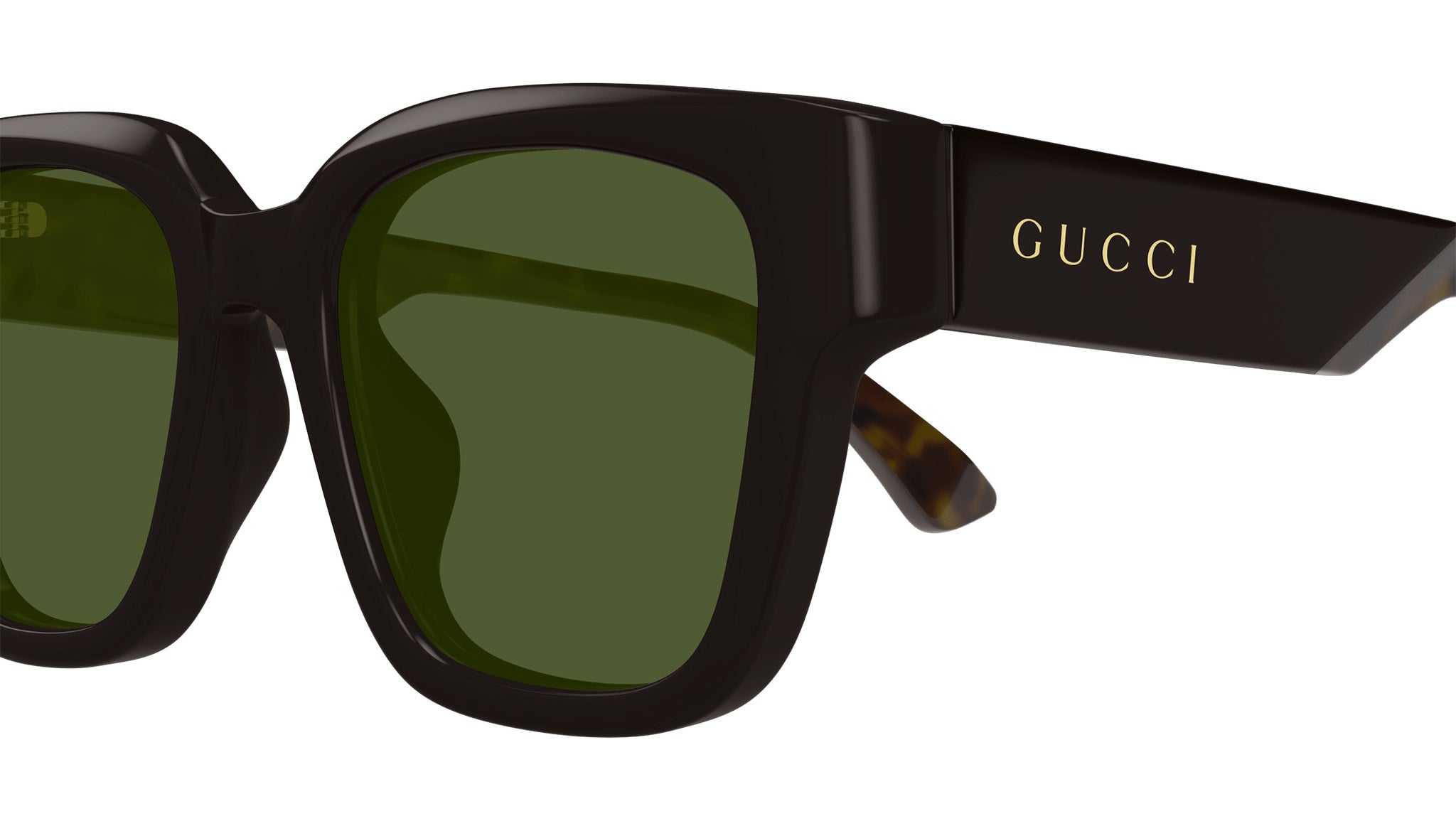 Occhiali da sole Gucci modello GG1670SK linea Lettering in acetato riciclato forma rettangolare codice colore 003 marrone lucido tinta unita con aste tartaruga e lenti verde tinta unita. Rivenditore autorizzato Gucci online. Gli occhiali vengono consegnati con custodia e accessori originali e sono coperti dalla garanzia ufficiale di 12 mesi del produttore.